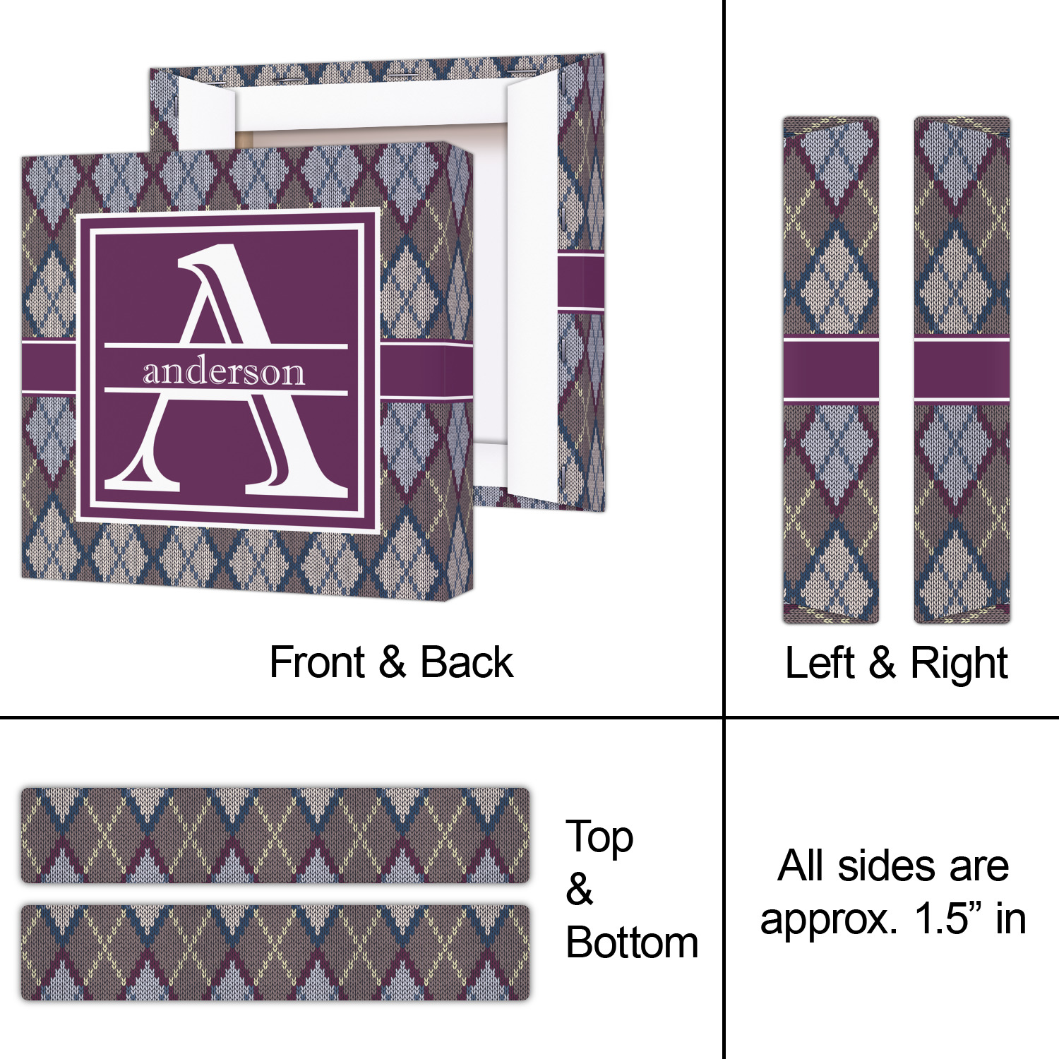 Add a cozy touch of a knit sweater to anything with our Knit Argyle design. The primary color of the design is gray with stitches of dark violet, dark blue, and cream. The design also includes a ribbon and label shown in dark violet.