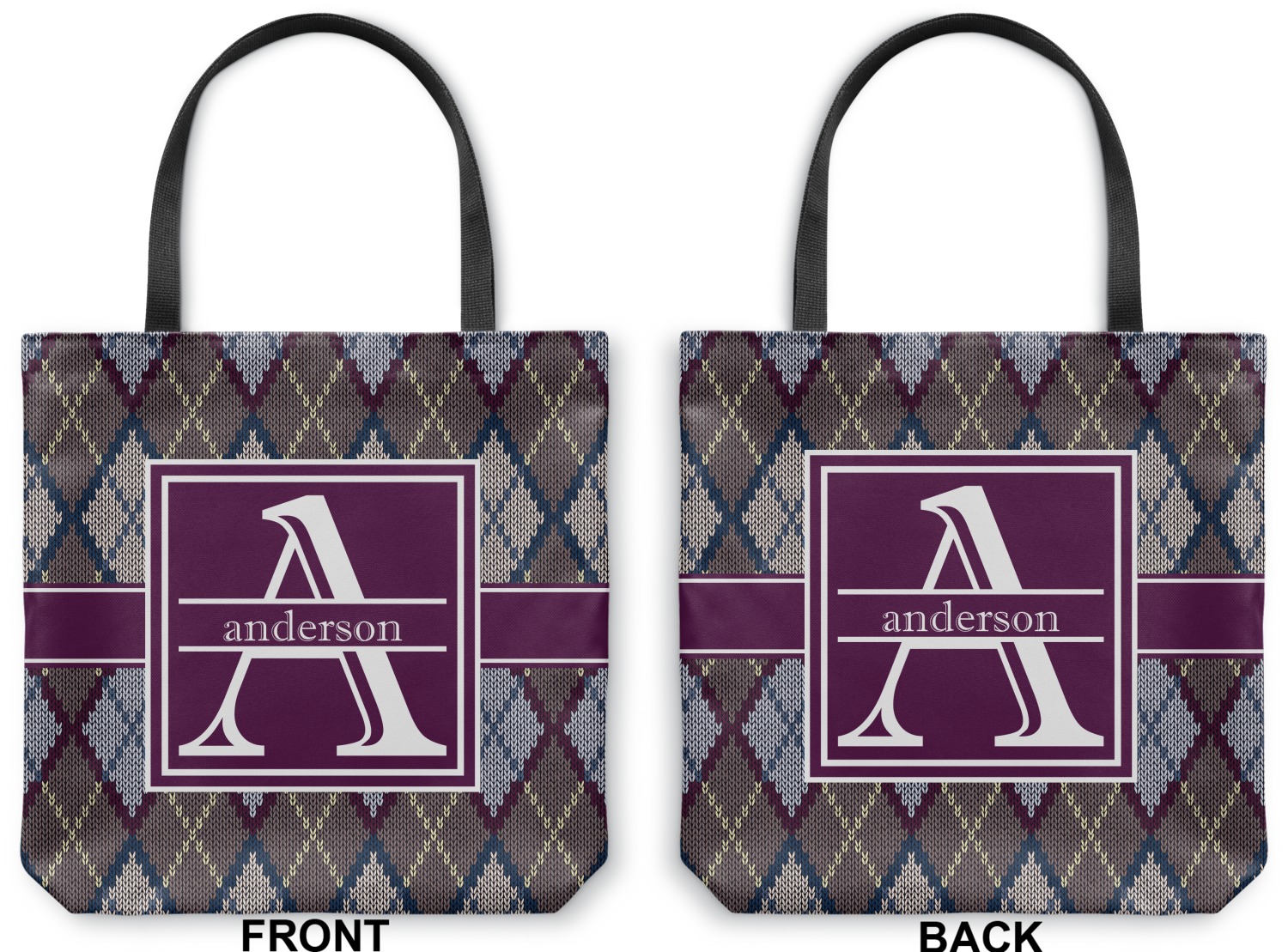 Add a cozy touch of a knit sweater to anything with our Knit Argyle design. The primary color of the design is gray with stitches of dark violet, dark blue, and cream. The design also includes a ribbon and label shown in dark violet.