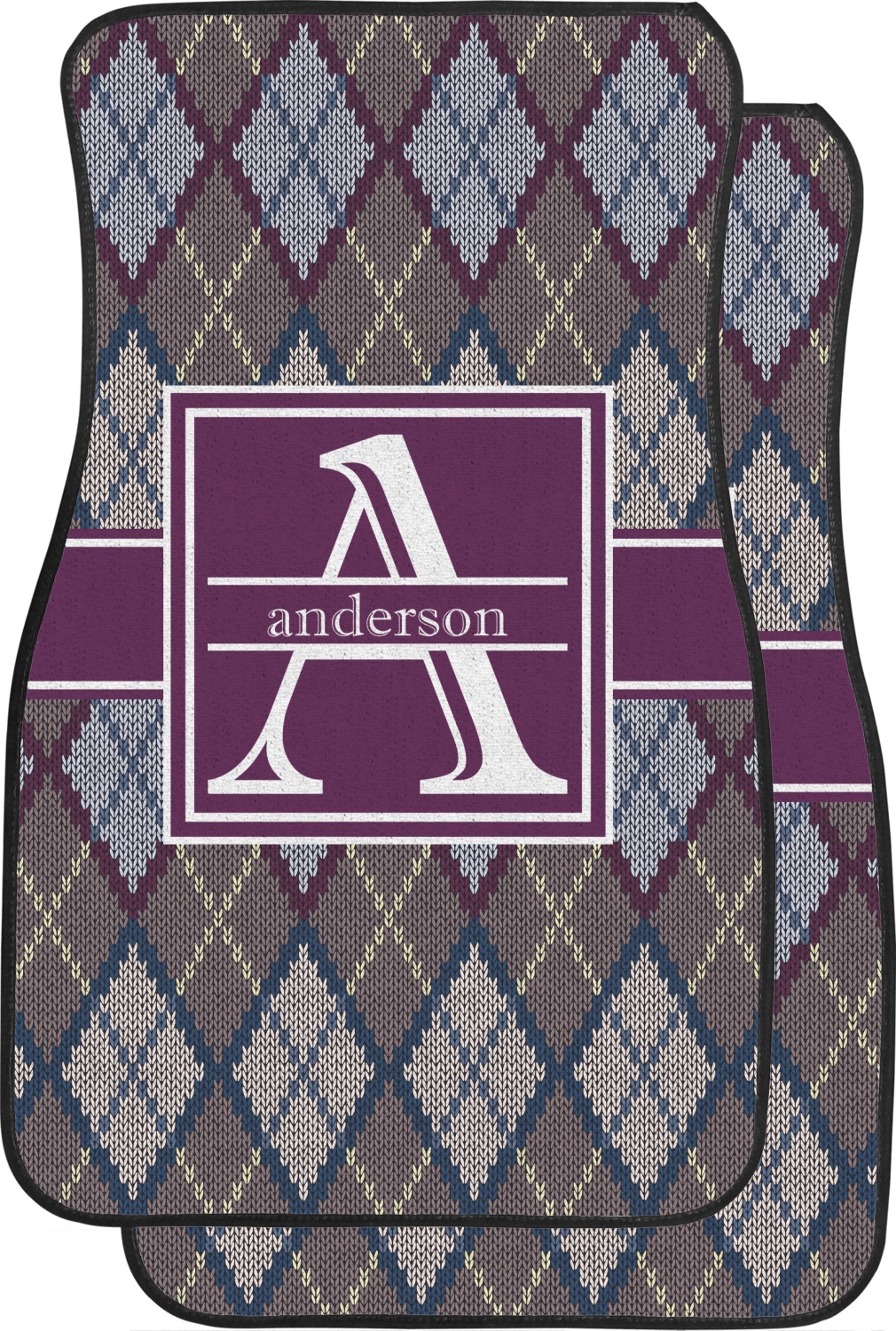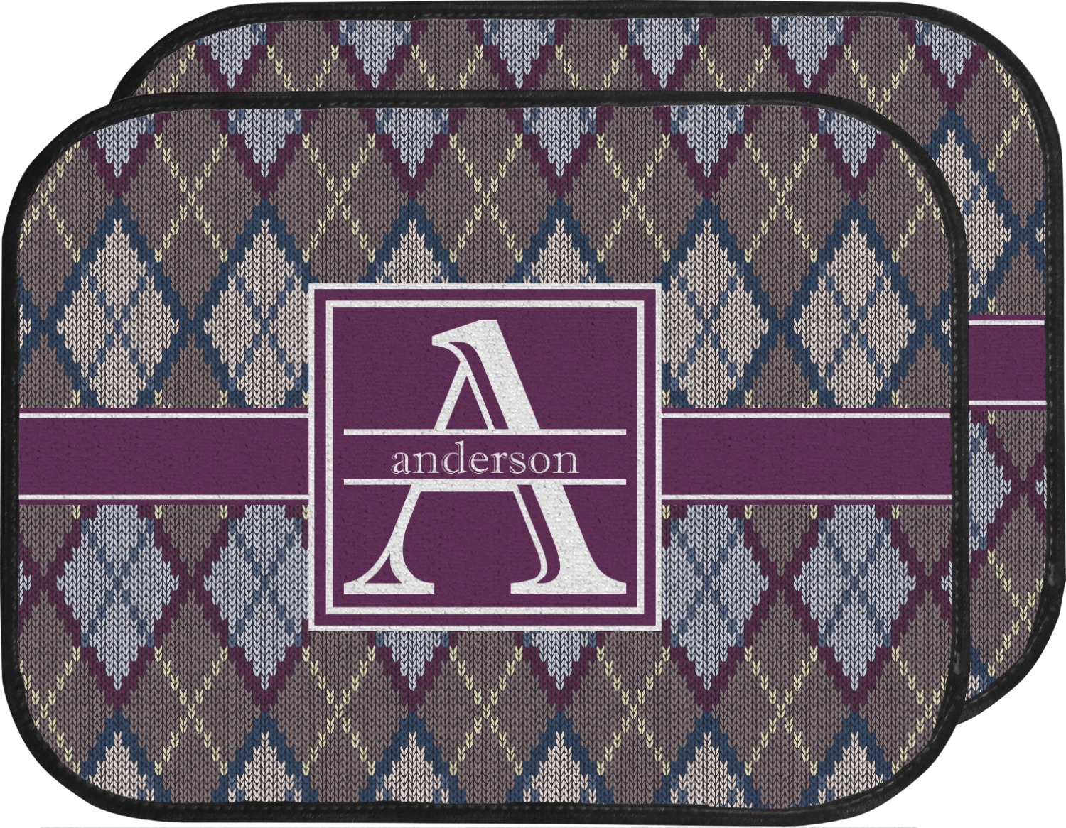 Add a cozy touch of a knit sweater to anything with our Knit Argyle design. The primary color of the design is gray with stitches of dark violet, dark blue, and cream. The design also includes a ribbon and label shown in dark violet.