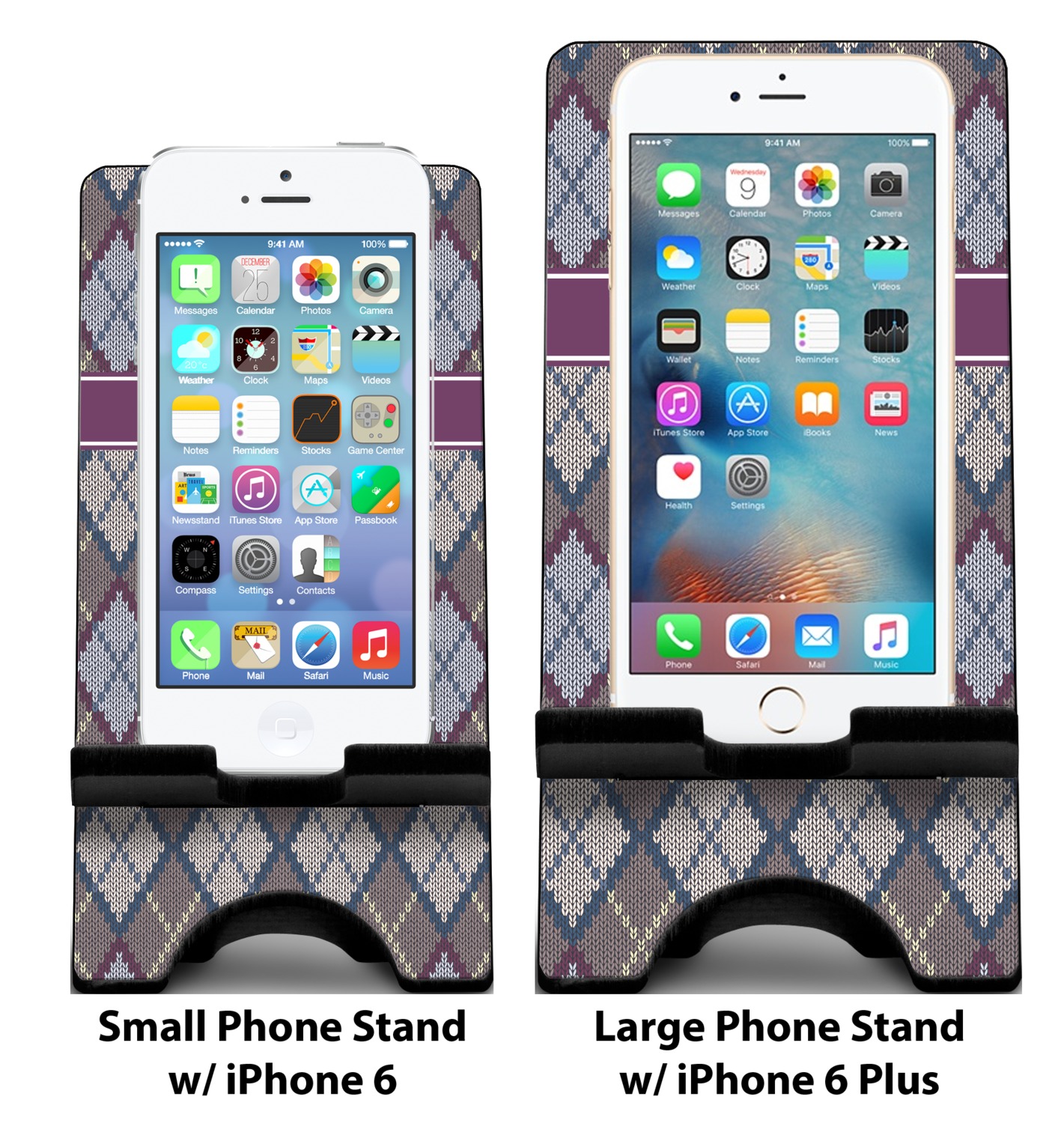 Add a cozy touch of a knit sweater to anything with our Knit Argyle design. The primary color of the design is gray with stitches of dark violet, dark blue, and cream. The design also includes a ribbon and label shown in dark violet.