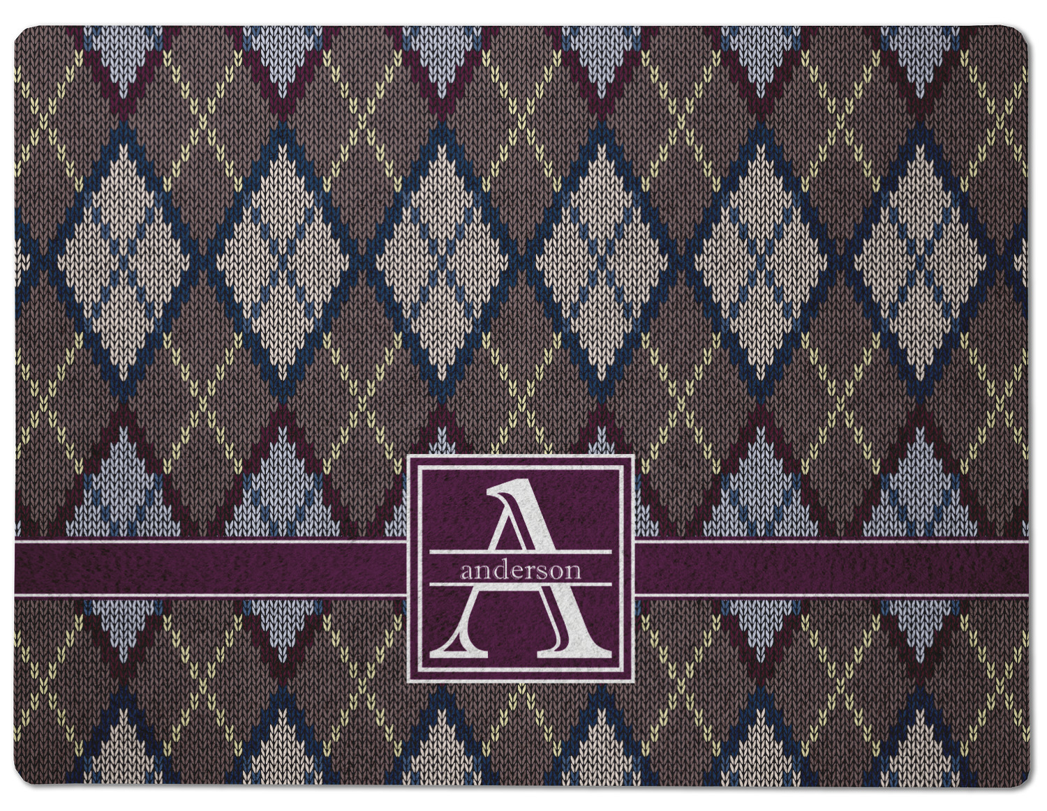 Add a cozy touch of a knit sweater to anything with our Knit Argyle design. The primary color of the design is gray with stitches of dark violet, dark blue, and cream. The design also includes a ribbon and label shown in dark violet.