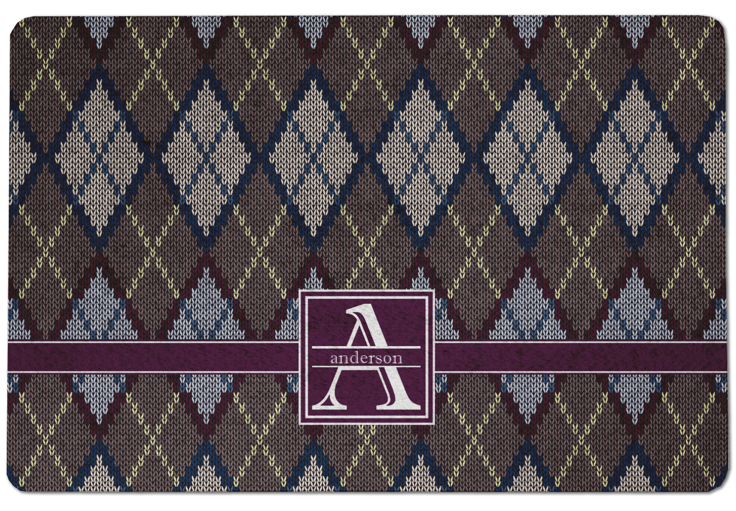 Add a cozy touch of a knit sweater to anything with our Knit Argyle design. The primary color of the design is gray with stitches of dark violet, dark blue, and cream. The design also includes a ribbon and label shown in dark violet.