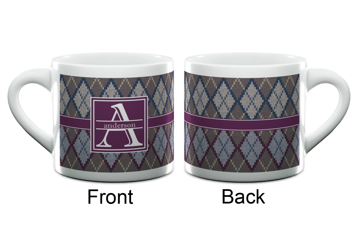 Each of our espresso mugs is a ceramic material sure to keep your drink warm. Personalize one cup for yourself, or order a set of 4! Its the perfect little gift for any coffee lover! We carry two sizes for you to personalize - 3 oz. (approx. 3.25" x 2.325" x 2.625") or 6 oz. (approx. 4" x 2.9" x 2.9"). Our 3 oz. mug is perfect for that single shot espresso while our 6 oz. mug can be your next favorite cappuccino cup holding two shots of espresso!