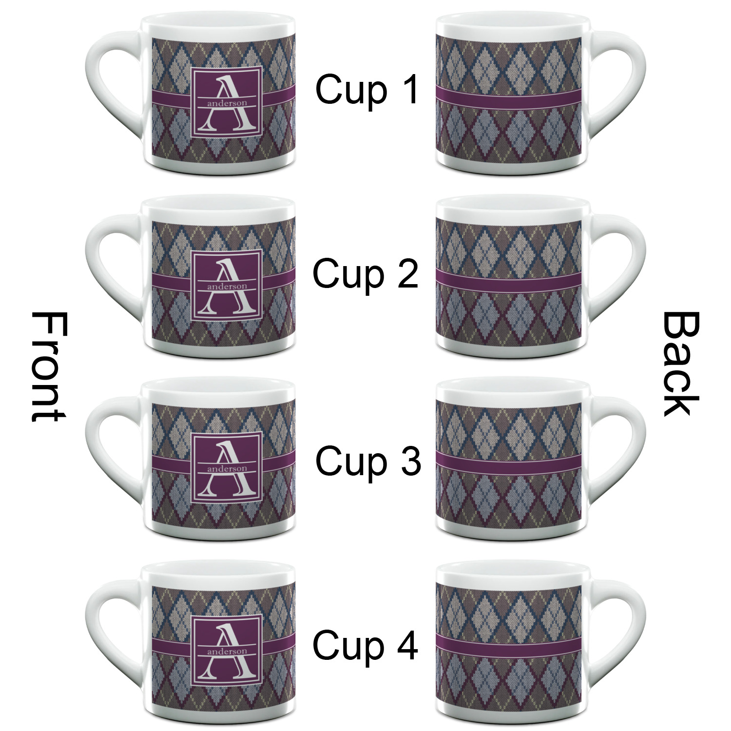 Each of our espresso mugs is a ceramic material sure to keep your drink warm. Personalize one cup for yourself, or order a set of 4! Its the perfect little gift for any coffee lover! We carry two sizes for you to personalize - 3 oz. (approx. 3.25" x 2.325" x 2.625") or 6 oz. (approx. 4" x 2.9" x 2.9"). Our 3 oz. mug is perfect for that single shot espresso while our 6 oz. mug can be your next favorite cappuccino cup holding two shots of espresso!