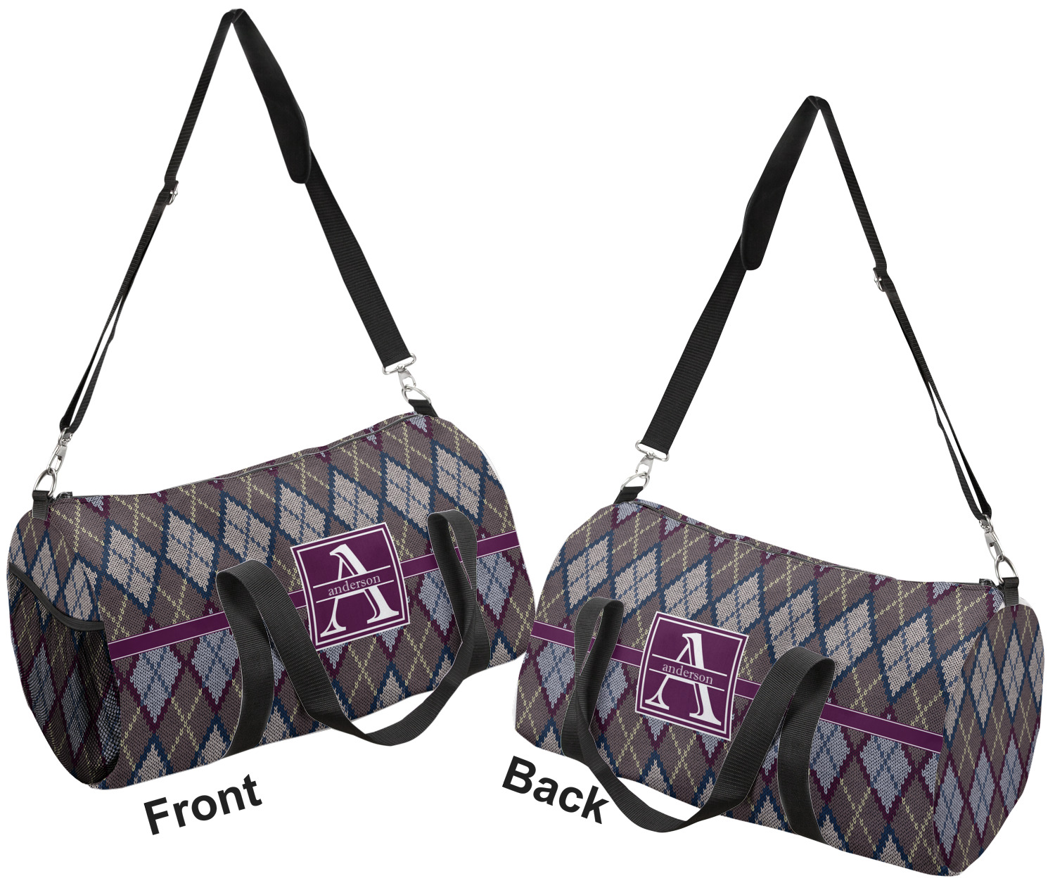 This duffle is a sturdy bag made of a canvas material. It comes in two sizes: Small (19"W x 9.5"H x 9.5"D) and Large (23"W x 12"H x 12"D). The bag is a cylindrical shape with a black adjustable strap and two handles. On one side is an elastic pouch to put a waterbottle or other small item. Your product will be sublimated with your design and is able to be designed on the front, back, and sides. Be sure to remember that the straps may cut into parts of your design if you upload your own artwork.
