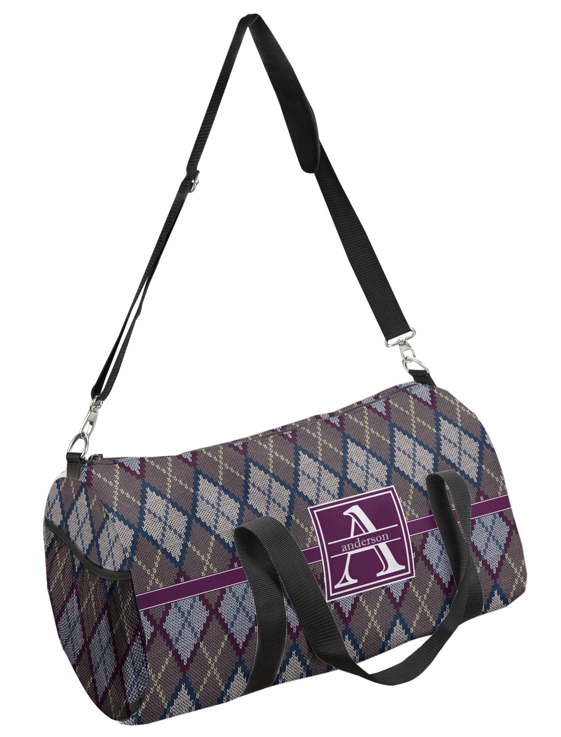 This duffle is a sturdy bag made of a canvas material. It comes in two sizes: Small (19"W x 9.5"H x 9.5"D) and Large (23"W x 12"H x 12"D). The bag is a cylindrical shape with a black adjustable strap and two handles. On one side is an elastic pouch to put a waterbottle or other small item. Your product will be sublimated with your design and is able to be designed on the front, back, and sides. Be sure to remember that the straps may cut into parts of your design if you upload your own artwork.