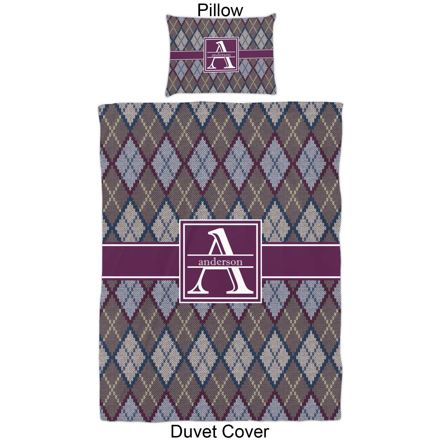 Add a cozy touch of a knit sweater to anything with our Knit Argyle design. The primary color of the design is gray with stitches of dark violet, dark blue, and cream. The design also includes a ribbon and label shown in dark violet.