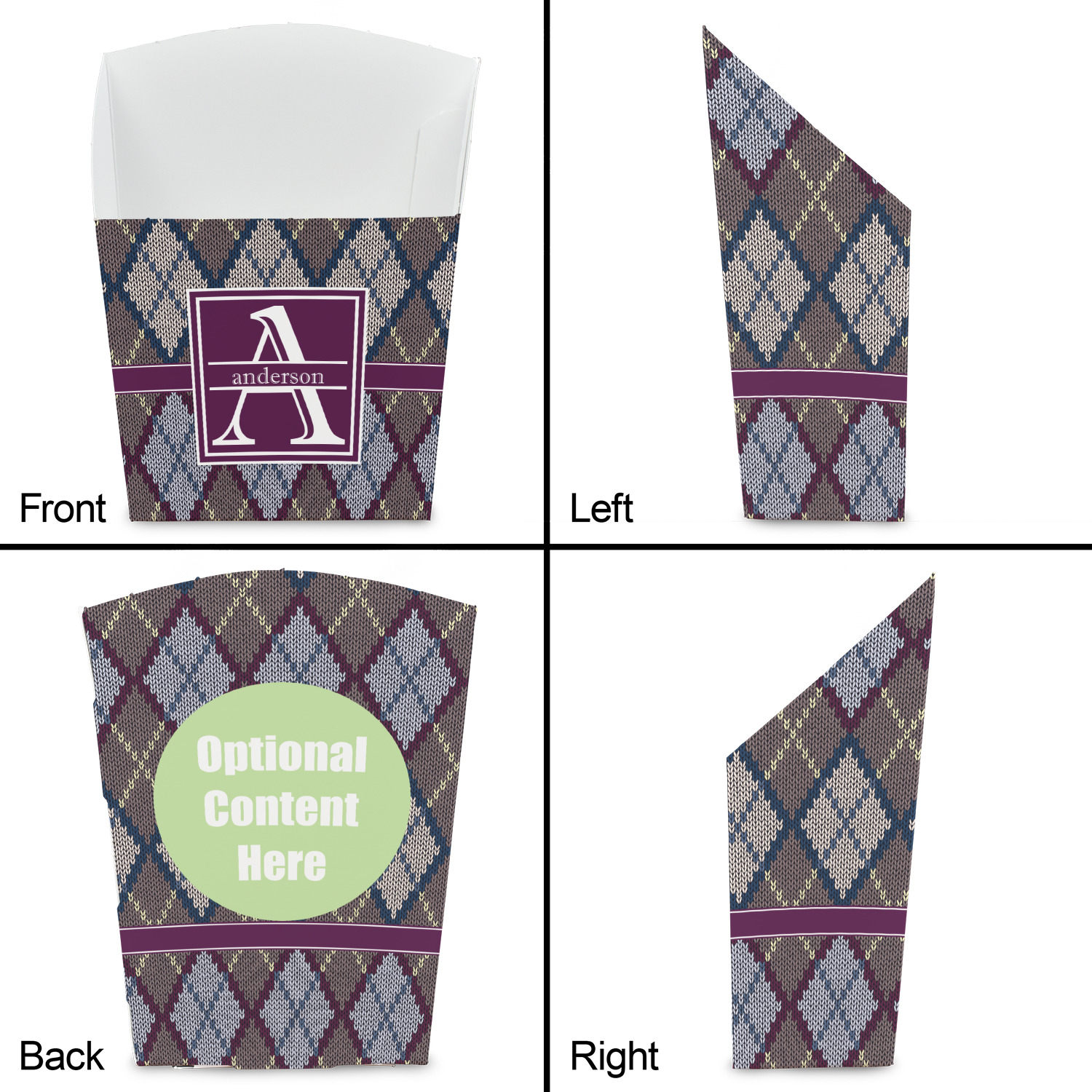 Add a cozy touch of a knit sweater to anything with our Knit Argyle design. The primary color of the design is gray with stitches of dark violet, dark blue, and cream. The design also includes a ribbon and label shown in dark violet.
