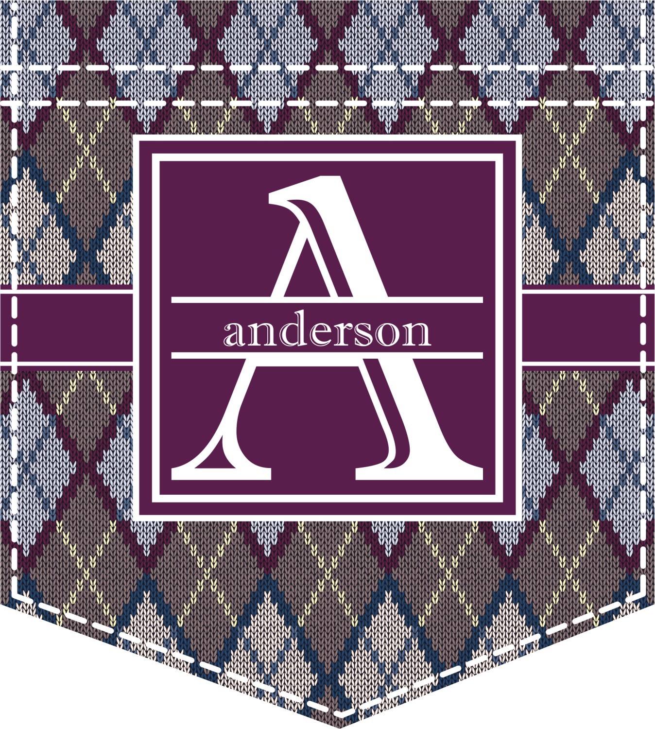 Add a cozy touch of a knit sweater to anything with our Knit Argyle design. The primary color of the design is gray with stitches of dark violet, dark blue, and cream. The design also includes a ribbon and label shown in dark violet.