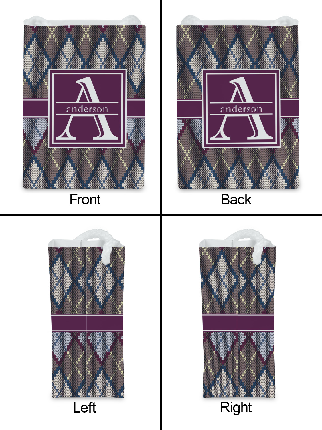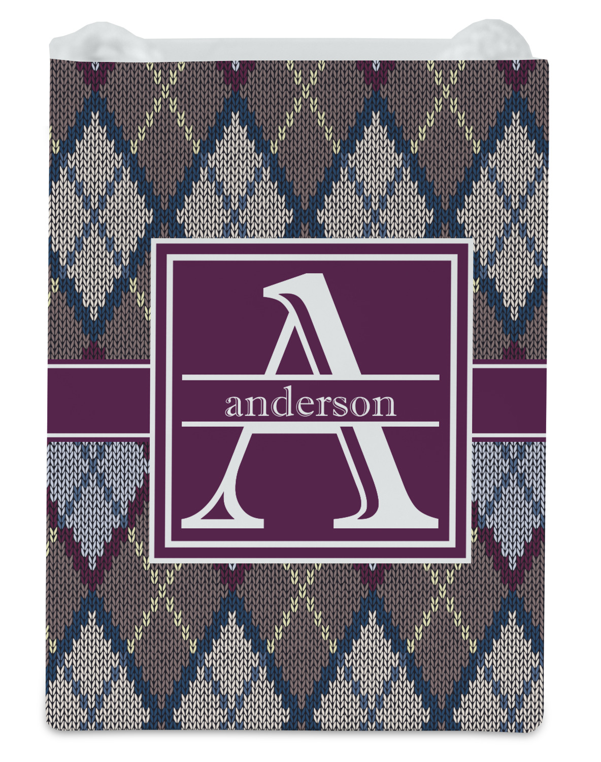 Add a cozy touch of a knit sweater to anything with our Knit Argyle design. The primary color of the design is gray with stitches of dark violet, dark blue, and cream. The design also includes a ribbon and label shown in dark violet.