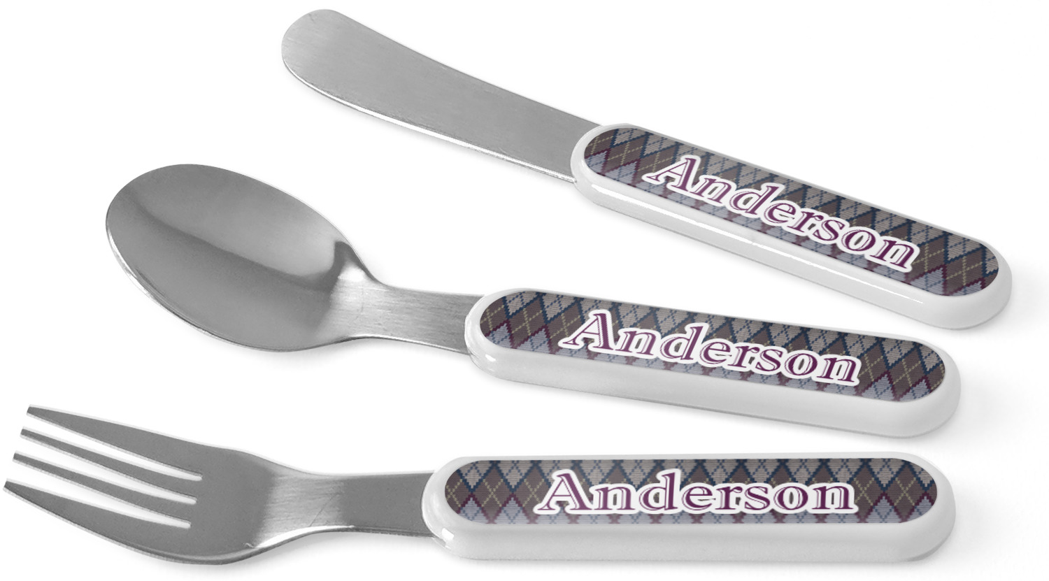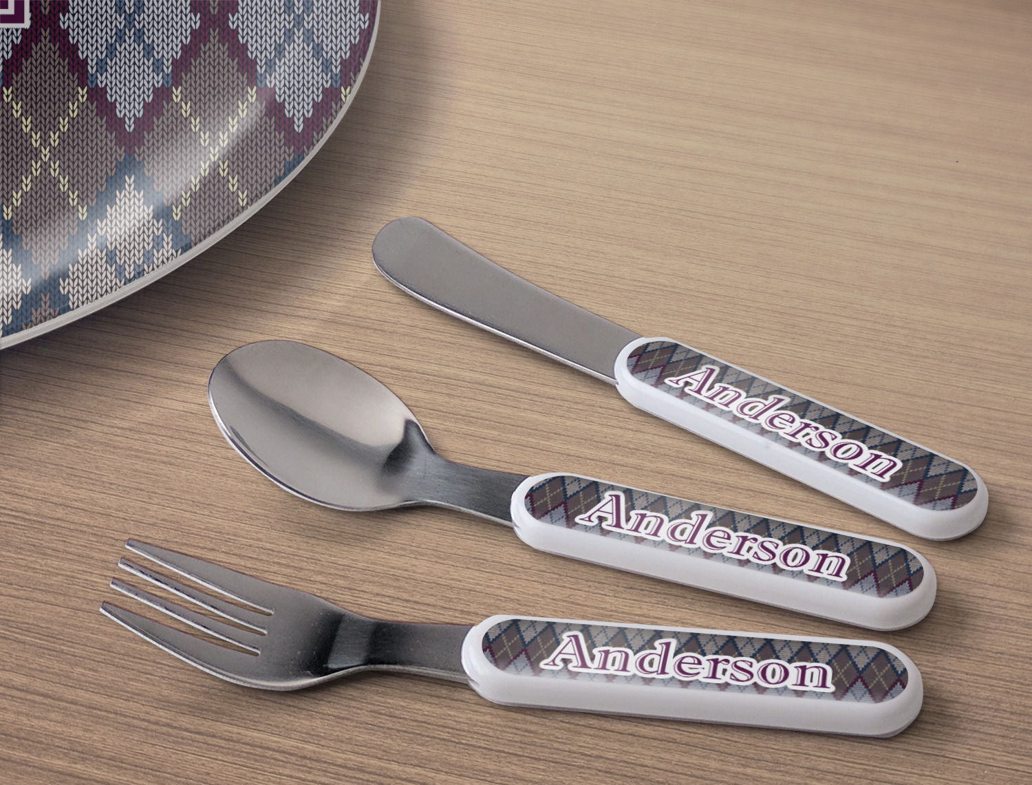 This set of kids' silverware includes a 5.5 inch spoon, fork, and knife, catered to your little one's needs. The prongs of this fork are flat and dull, while our spoon is small enough for tiny mouths, and the dullness of the knife itself resembles a butter knife, at most. These kids' utensils are made of stainless steel, while the handles are crafted from a durable plastic that will withstand the energy and use of your young one. We print your customization across the handles, making the cutlery set unique to your child only.