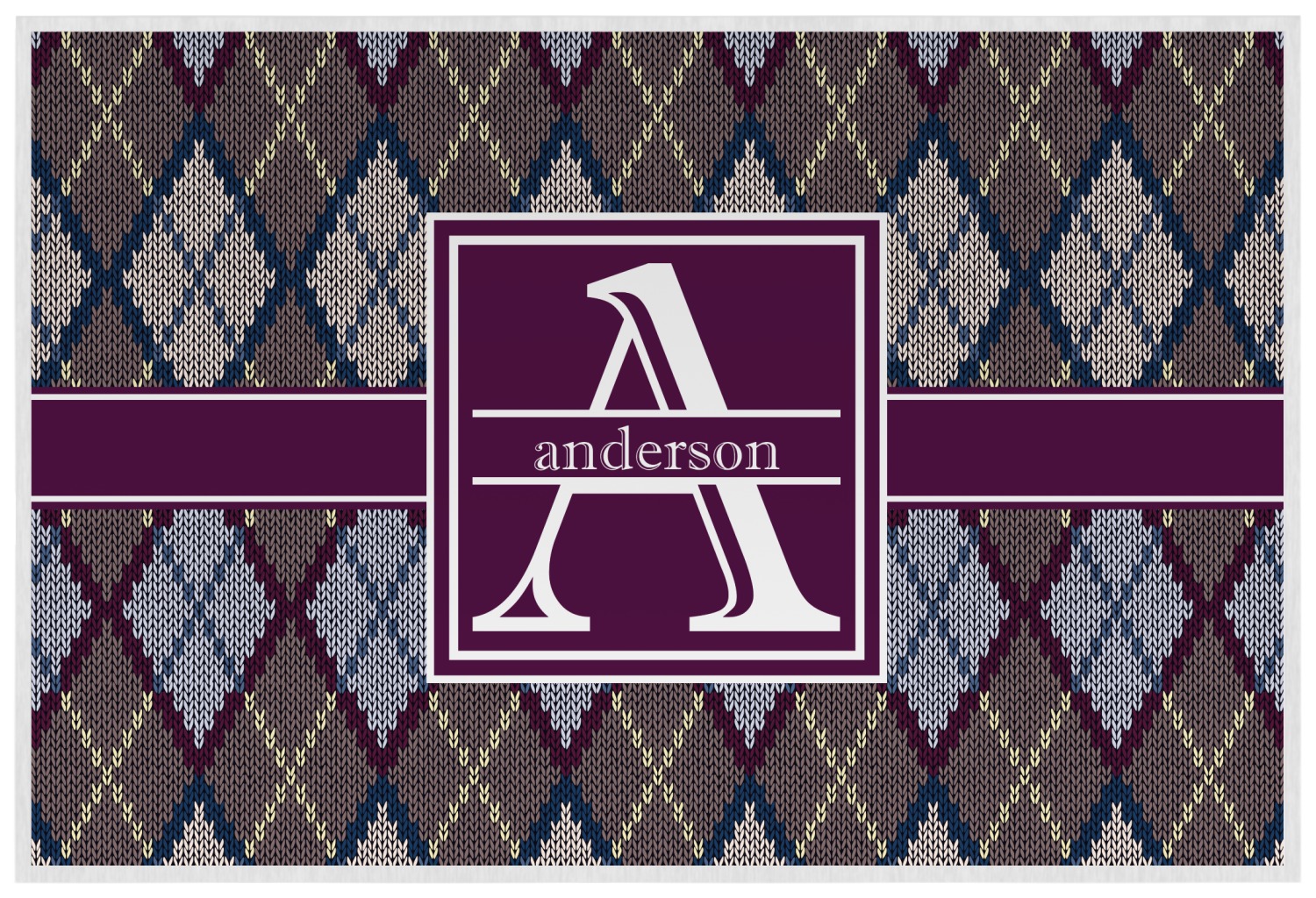 Add a cozy touch of a knit sweater to anything with our Knit Argyle design. The primary color of the design is gray with stitches of dark violet, dark blue, and cream. The design also includes a ribbon and label shown in dark violet.