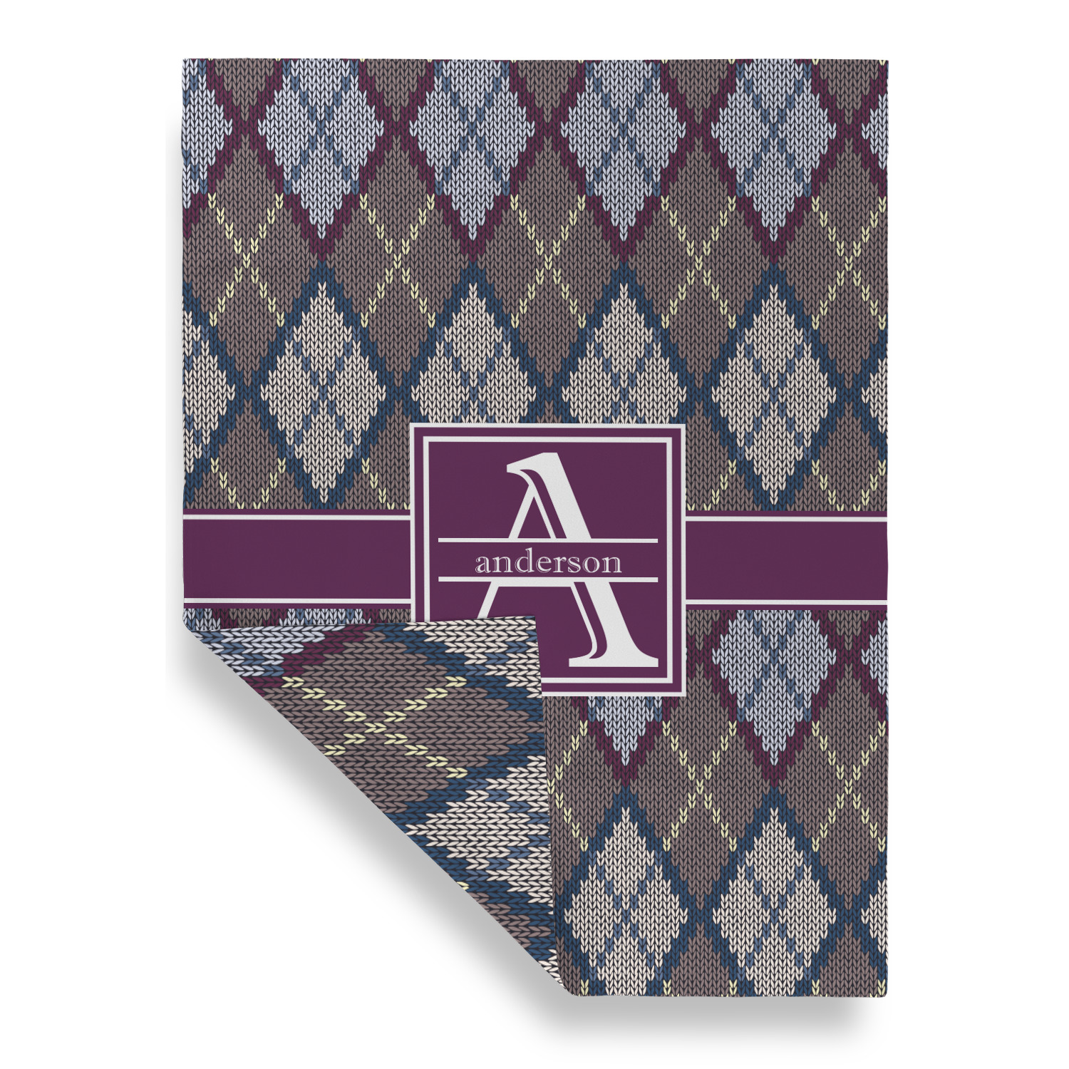 Add a cozy touch of a knit sweater to anything with our Knit Argyle design. The primary color of the design is gray with stitches of dark violet, dark blue, and cream. The design also includes a ribbon and label shown in dark violet.