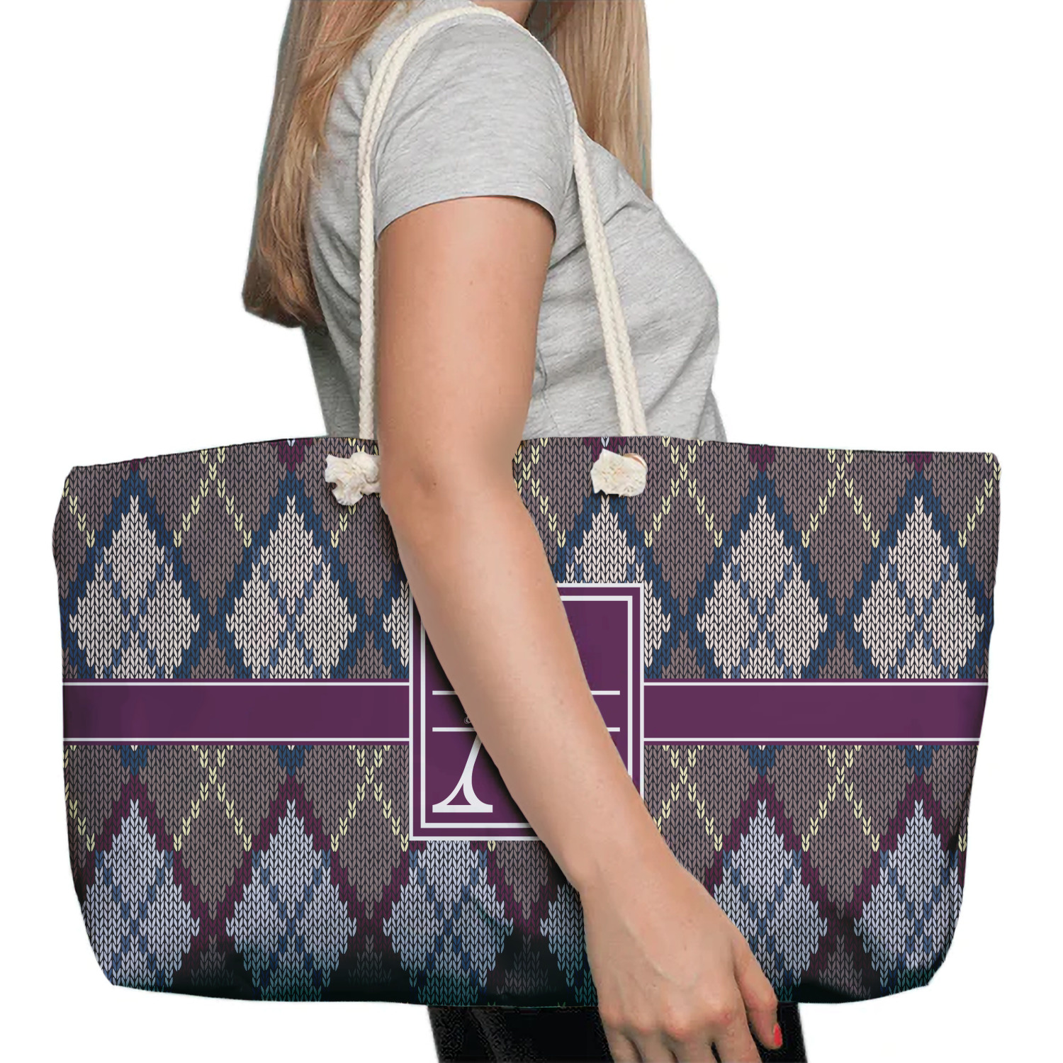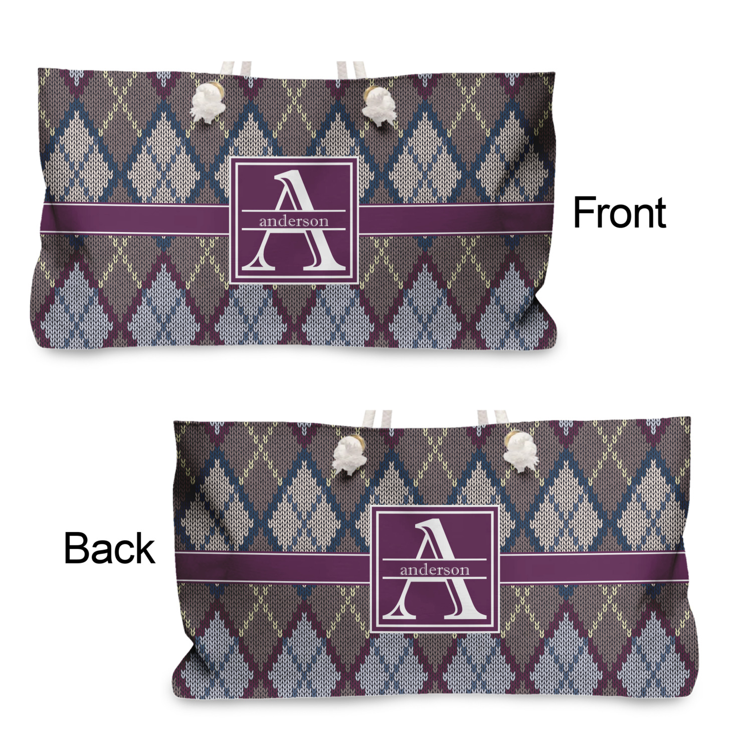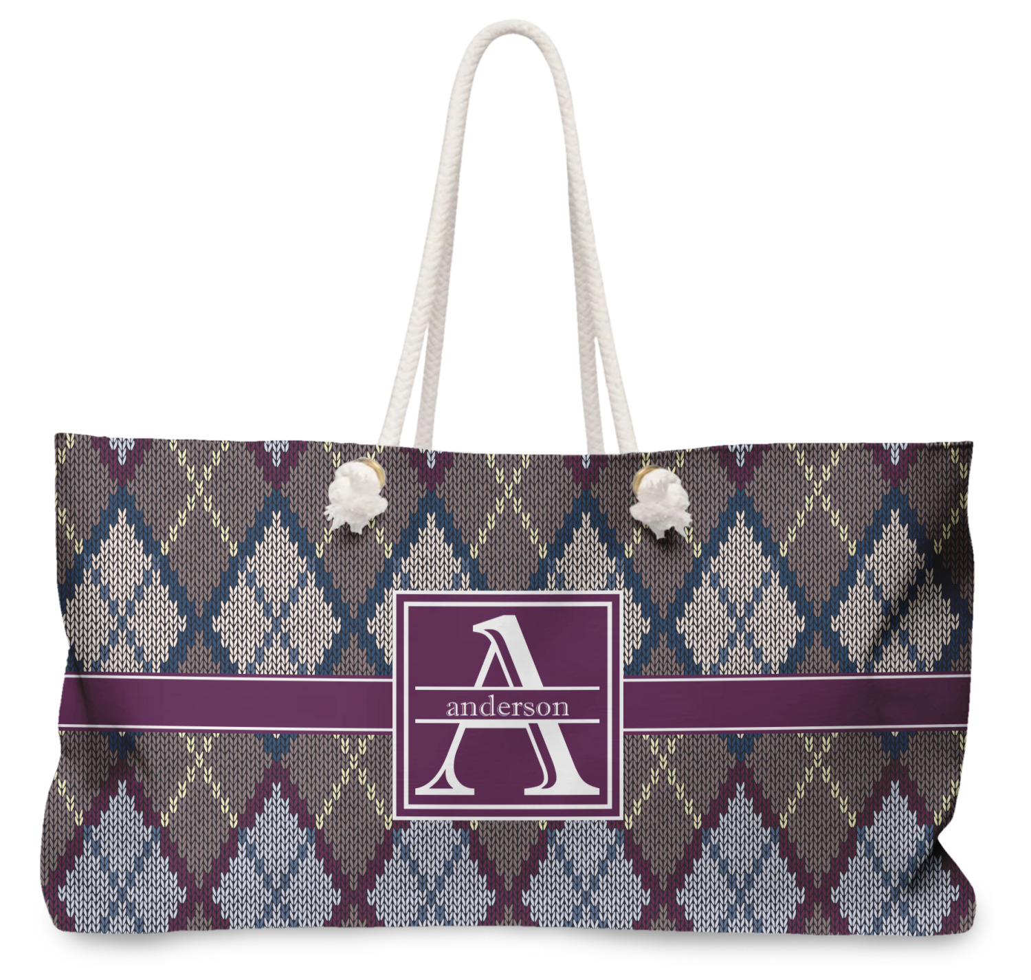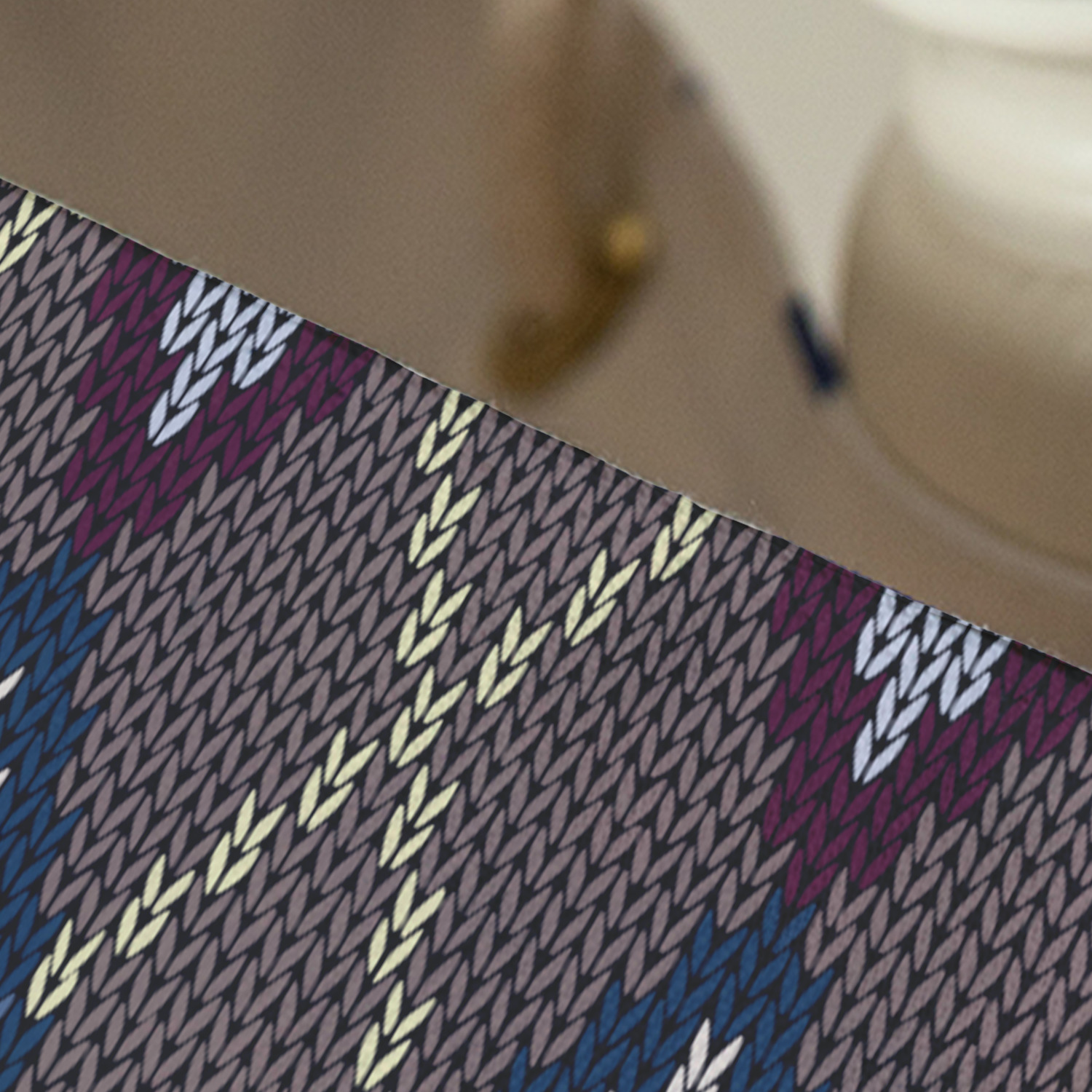 Add a cozy touch of a knit sweater to anything with our Knit Argyle design. The primary color of the design is gray with stitches of dark violet, dark blue, and cream. The design also includes a ribbon and label shown in dark violet.