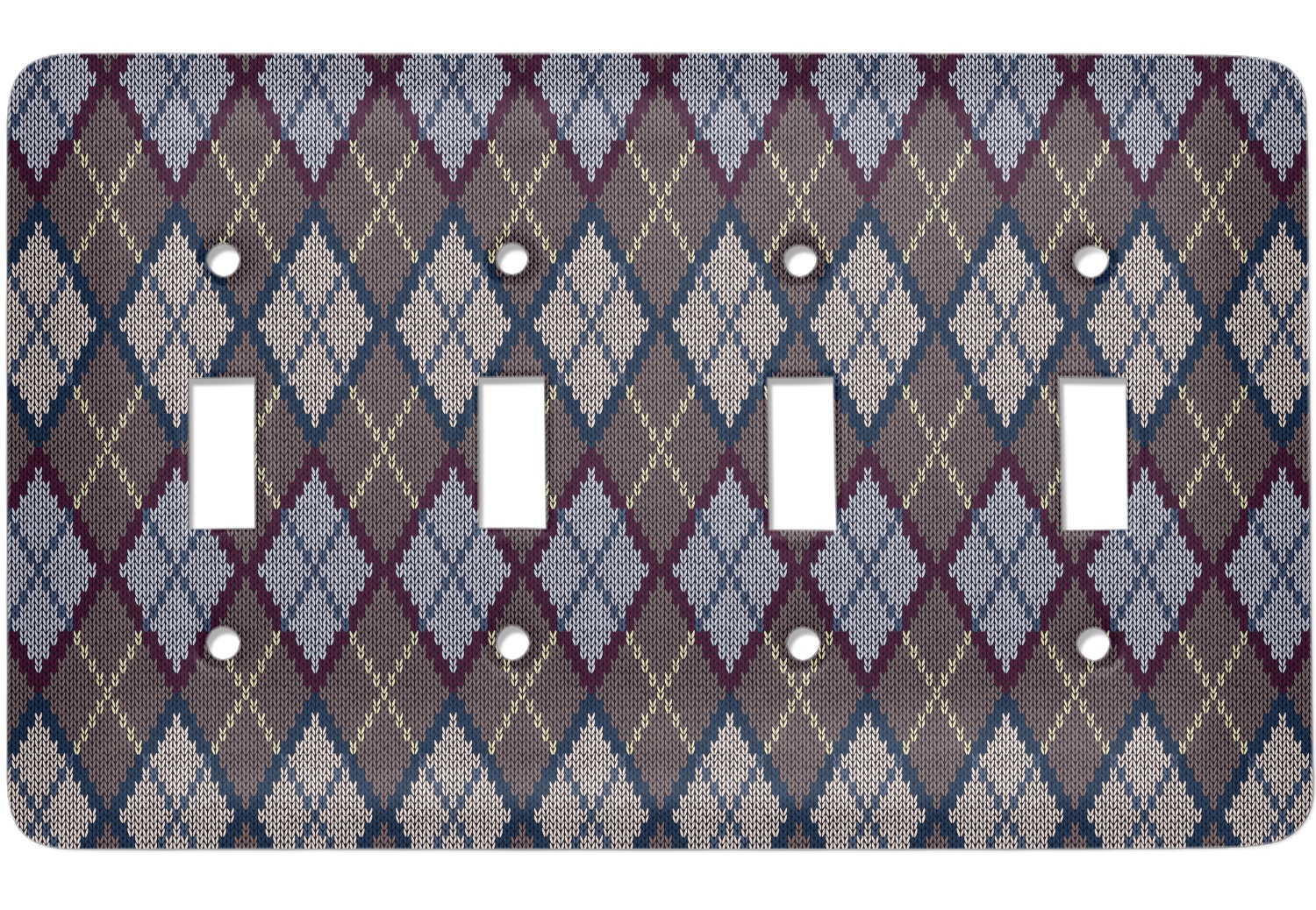 Add a cozy touch of a knit sweater to anything with our Knit Argyle design. The primary color of the design is gray with stitches of dark violet, dark blue, and cream. The design also includes a ribbon and label shown in dark violet.