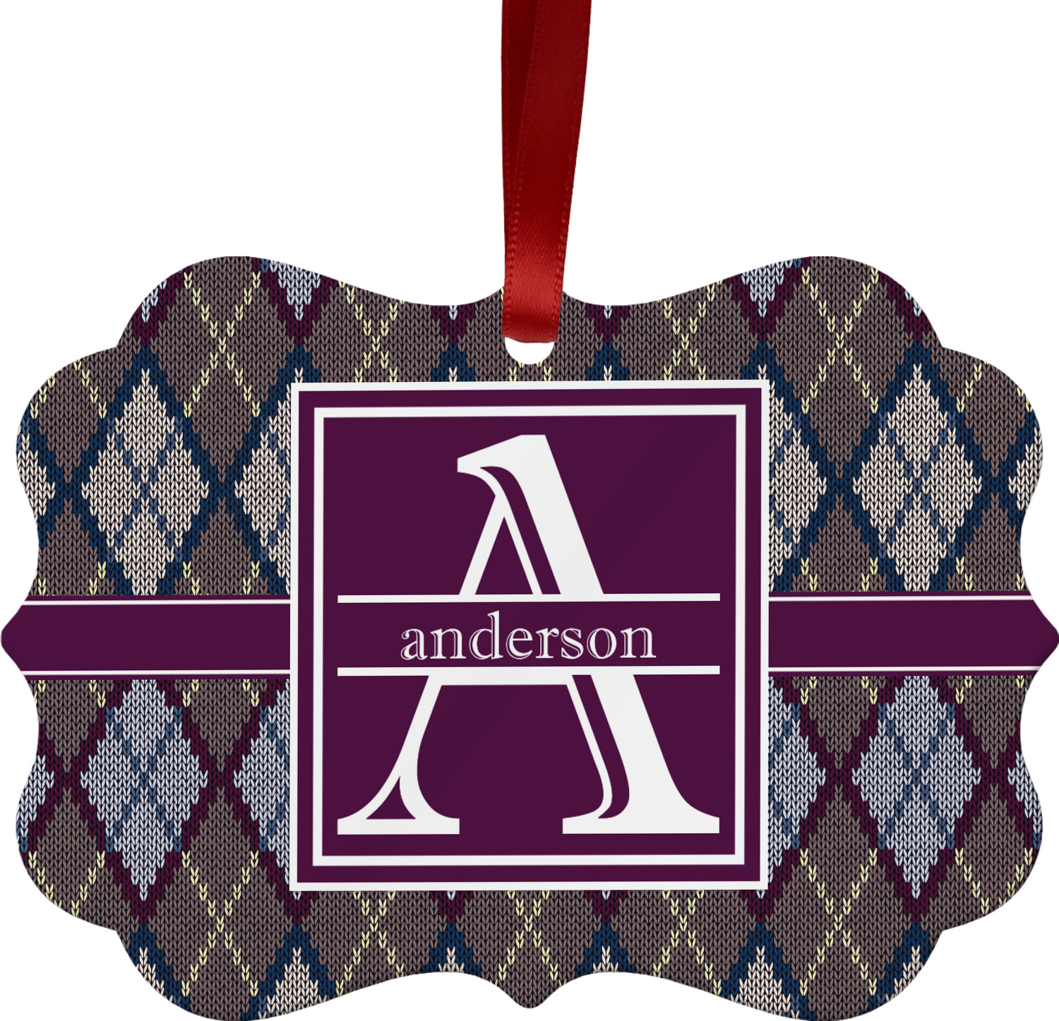 Add a cozy touch of a knit sweater to anything with our Knit Argyle design. The primary color of the design is gray with stitches of dark violet, dark blue, and cream. The design also includes a ribbon and label shown in dark violet.