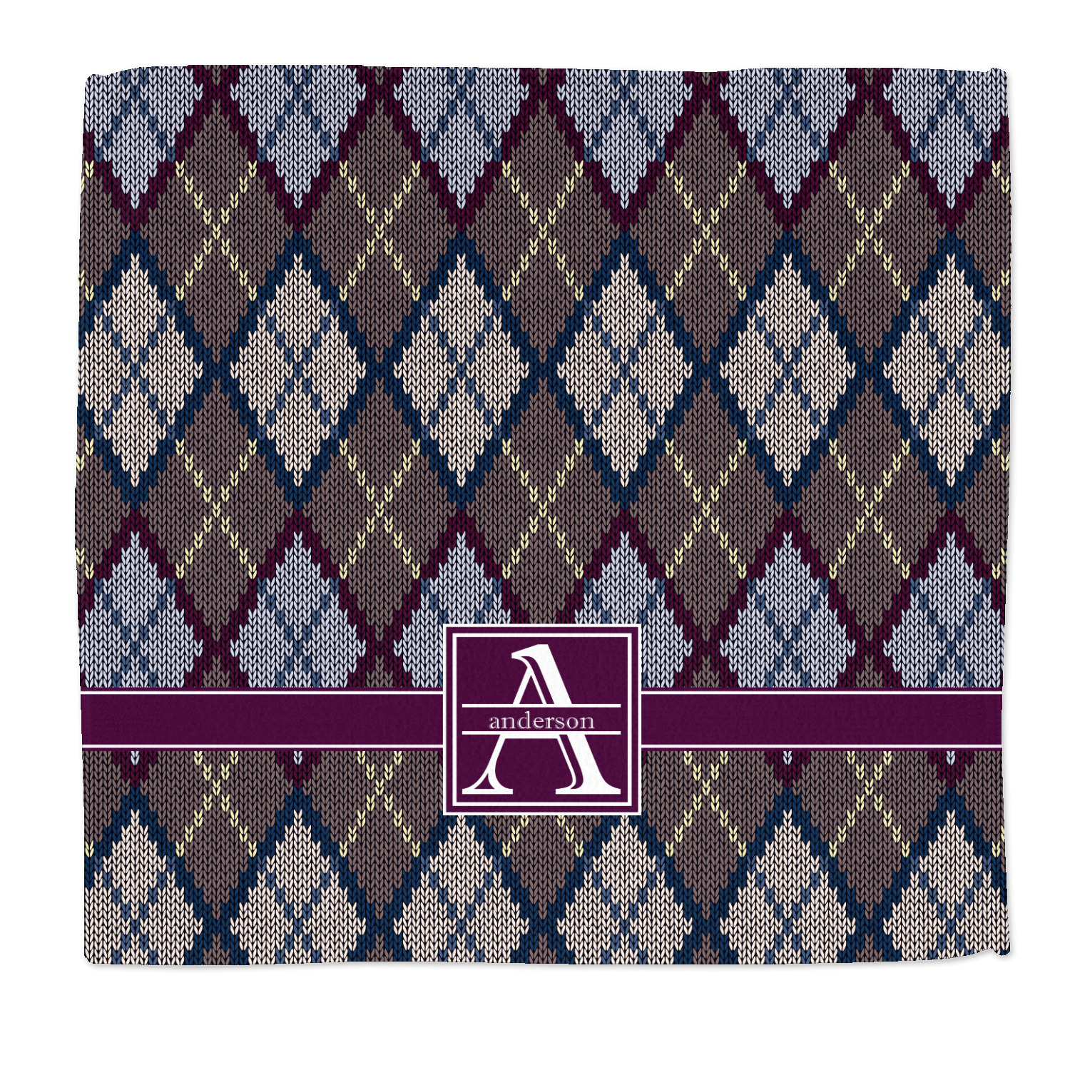 Add a cozy touch of a knit sweater to anything with our Knit Argyle design. The primary color of the design is gray with stitches of dark violet, dark blue, and cream. The design also includes a ribbon and label shown in dark violet.