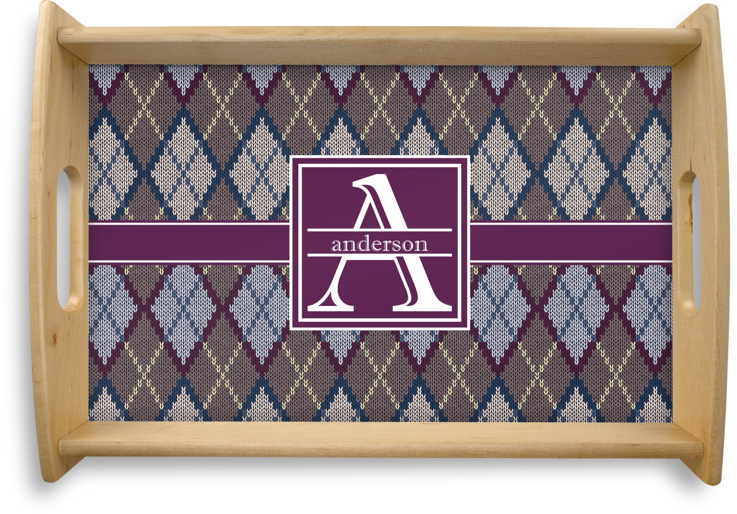 This serving tray with handles features square edges and two rounded sides, creating a very modern look. Each side is fabricated from a beautifully cut, natural wood. The bottom of the interior of the tray displays your customized design in bright, vibrant color. The tray is sold in both a black color and a natural wood look. Each variation of the wood serving tray has two sizes: Small, which is 14" x 10" x 2.25", and Large, which is 19.5" x 13.5" x 2.75".