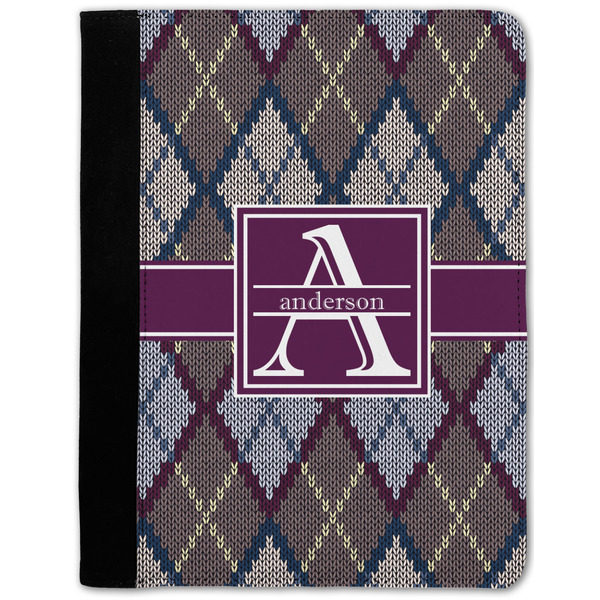 Add a cozy touch of a knit sweater to anything with our Knit Argyle design. The primary color of the design is gray with stitches of dark violet, dark blue, and cream. The design also includes a ribbon and label shown in dark violet.