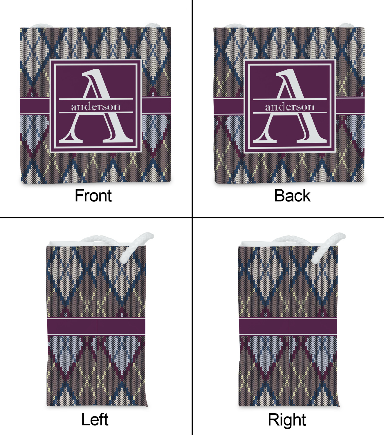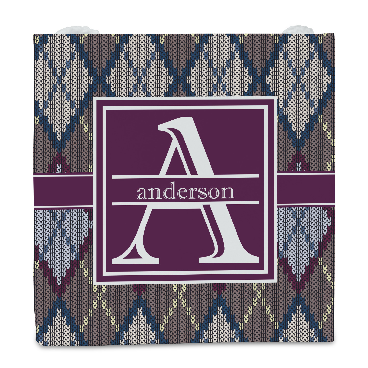 Add a cozy touch of a knit sweater to anything with our Knit Argyle design. The primary color of the design is gray with stitches of dark violet, dark blue, and cream. The design also includes a ribbon and label shown in dark violet.