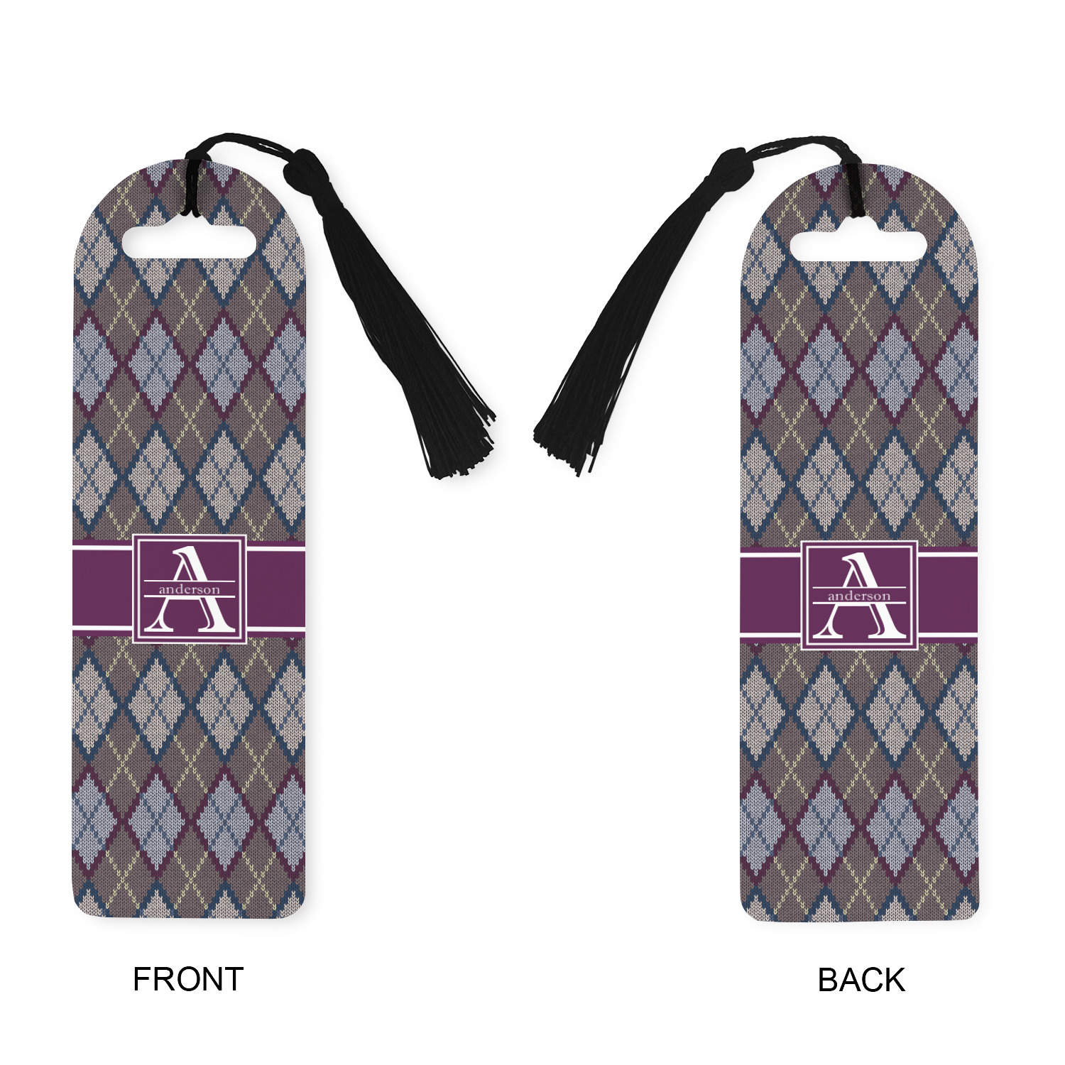 Made from a durable, flexible plastic, these bookmarks are printed with your custom design on them. With the tassel on them they make it easy to find your page in your book. These are a rectangular shape 7 1/4 inches tall with a rounded top and are approximately 2 1/4 inches wide.