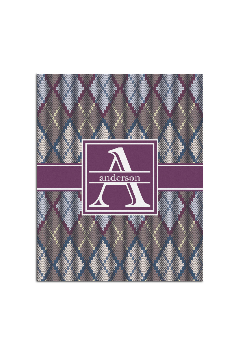 Add a cozy touch of a knit sweater to anything with our Knit Argyle design. The primary color of the design is gray with stitches of dark violet, dark blue, and cream. The design also includes a ribbon and label shown in dark violet.