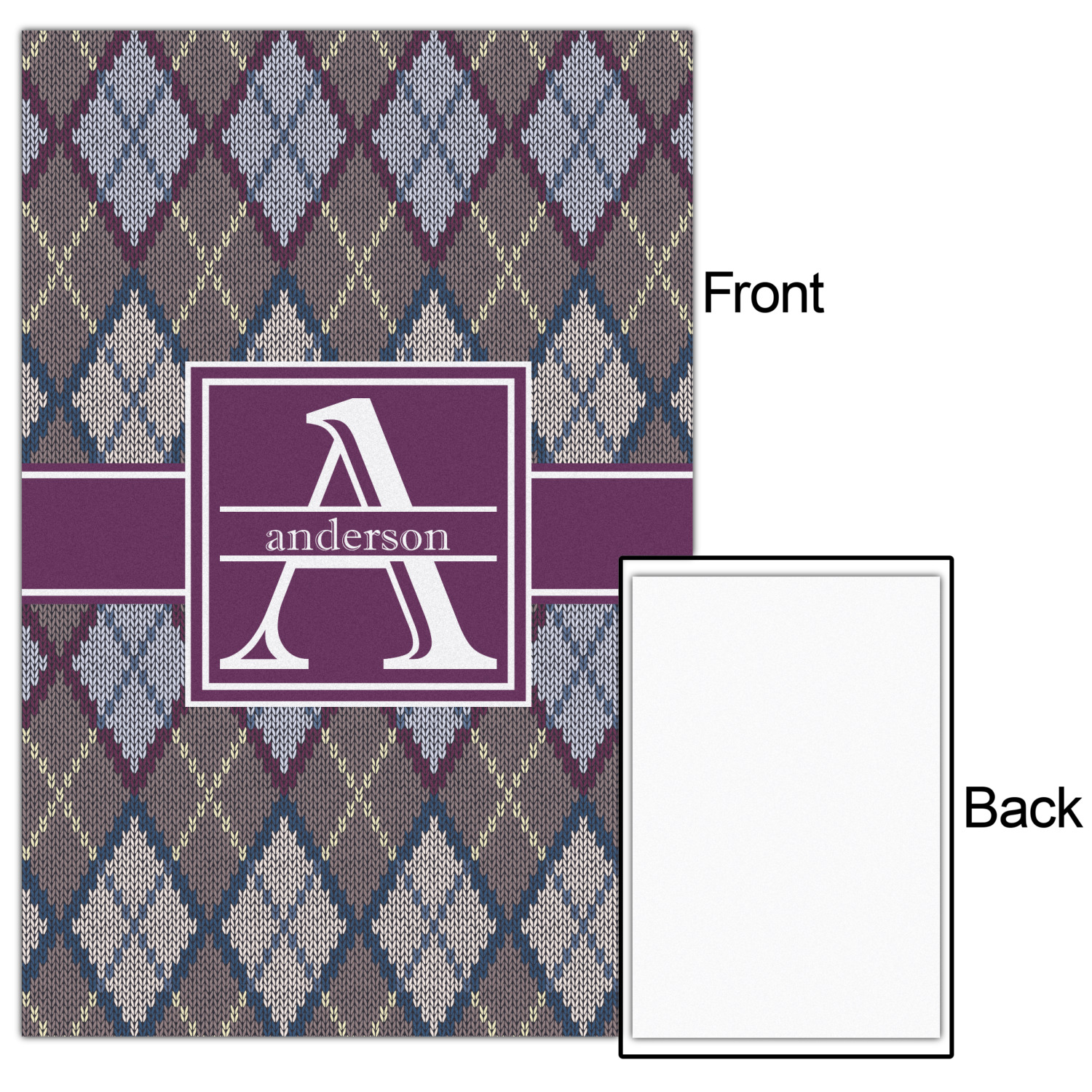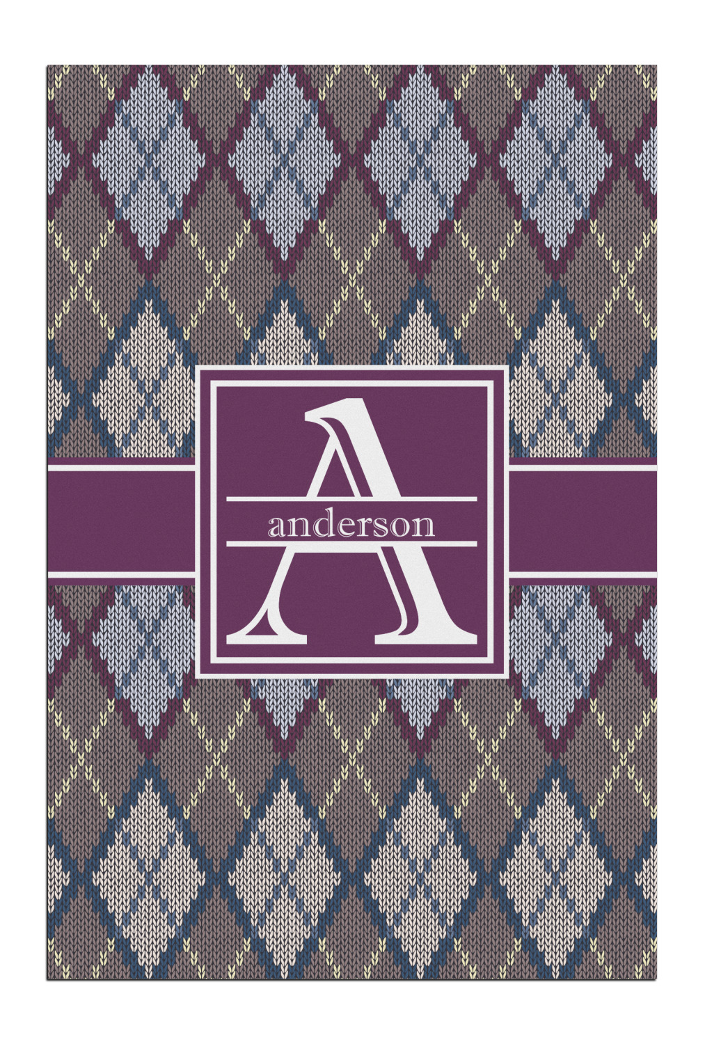 Add a cozy touch of a knit sweater to anything with our Knit Argyle design. The primary color of the design is gray with stitches of dark violet, dark blue, and cream. The design also includes a ribbon and label shown in dark violet.
