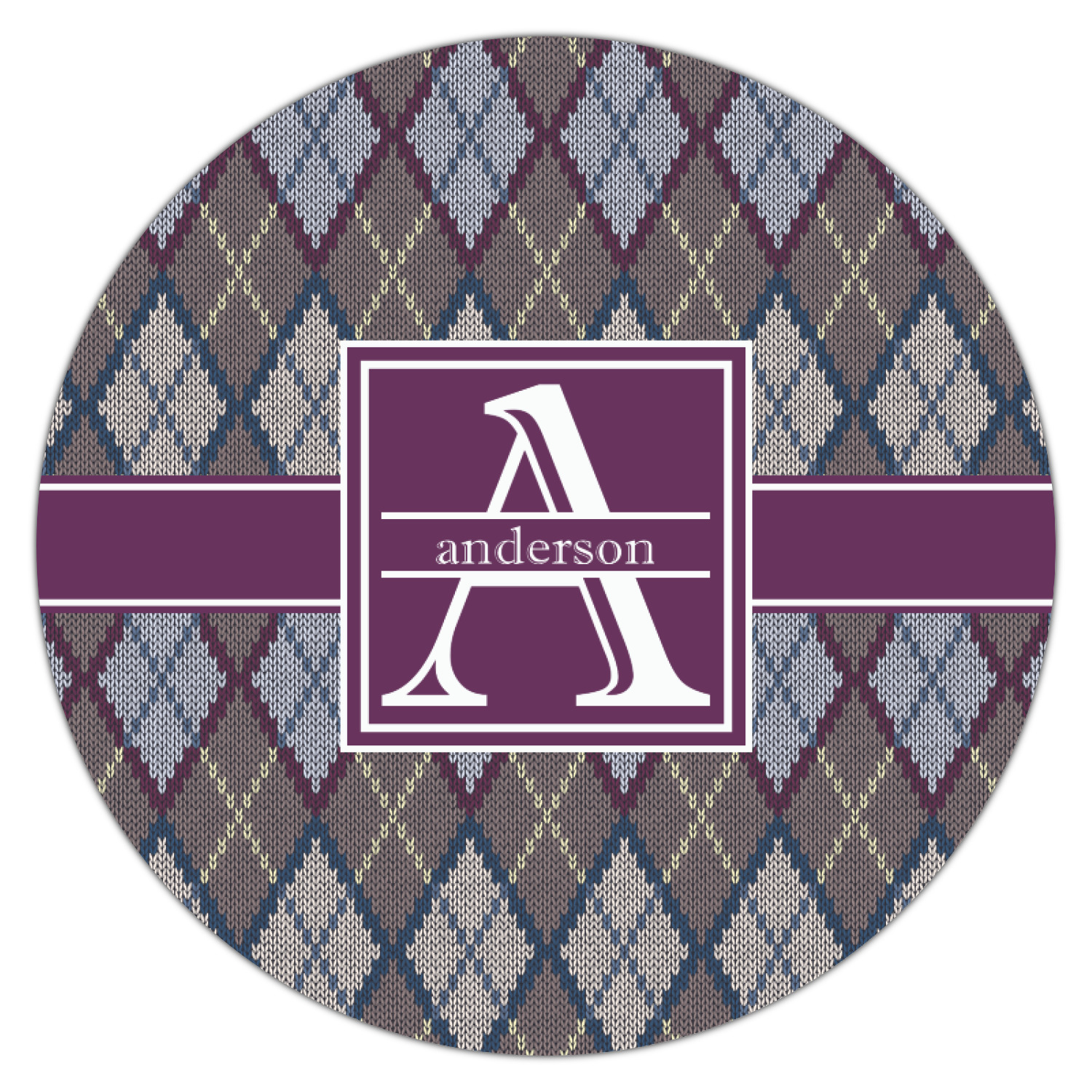 Add a cozy touch of a knit sweater to anything with our Knit Argyle design. The primary color of the design is gray with stitches of dark violet, dark blue, and cream. The design also includes a ribbon and label shown in dark violet.