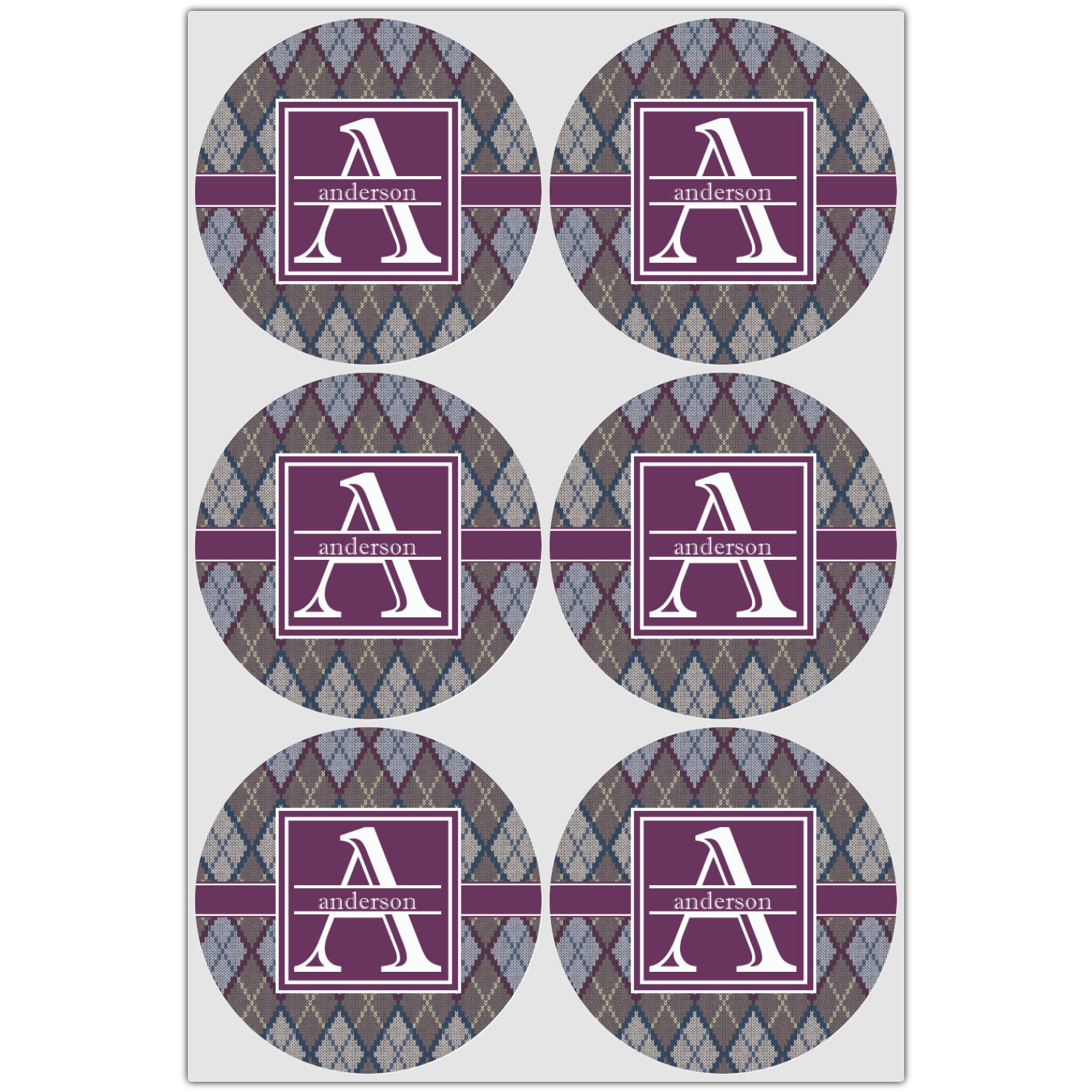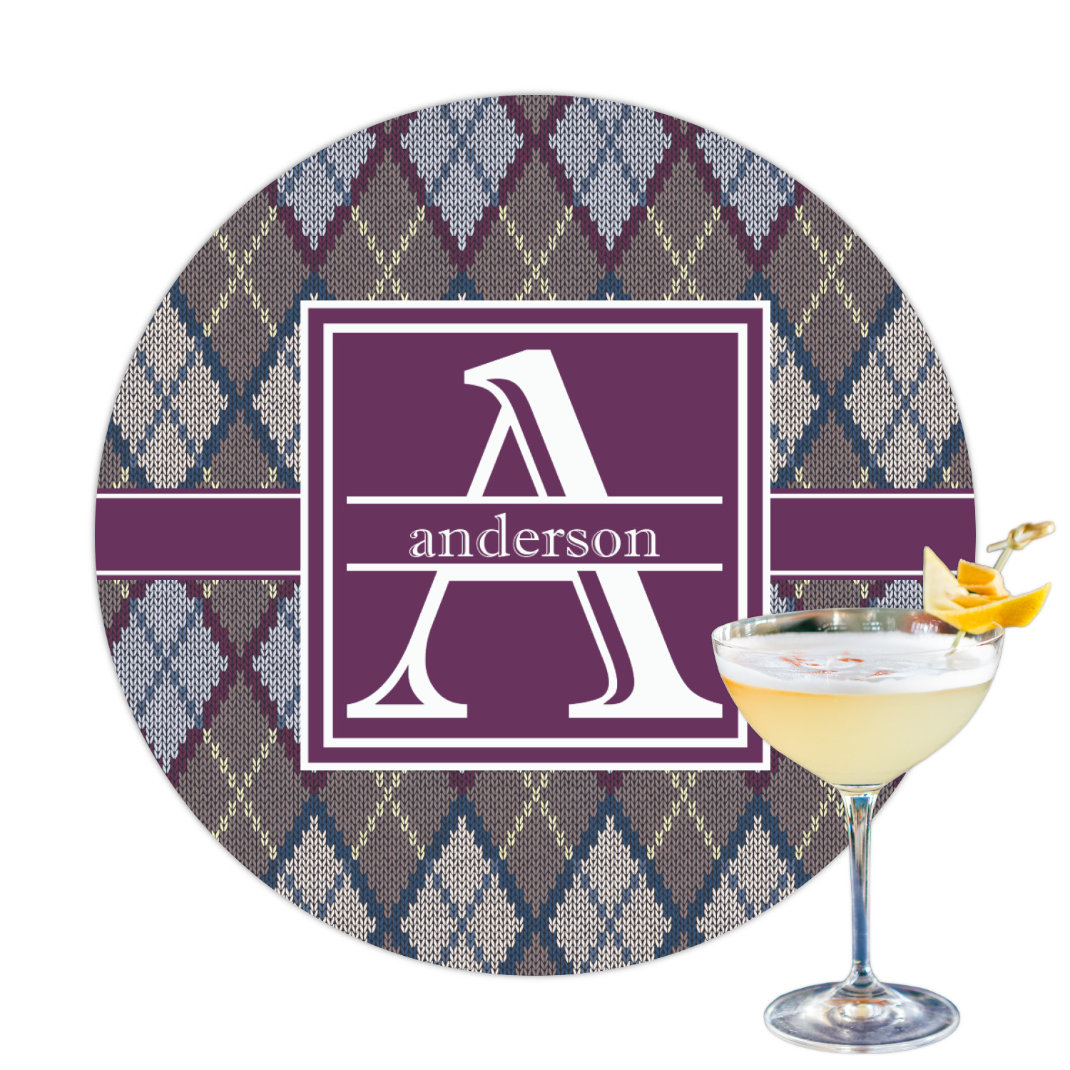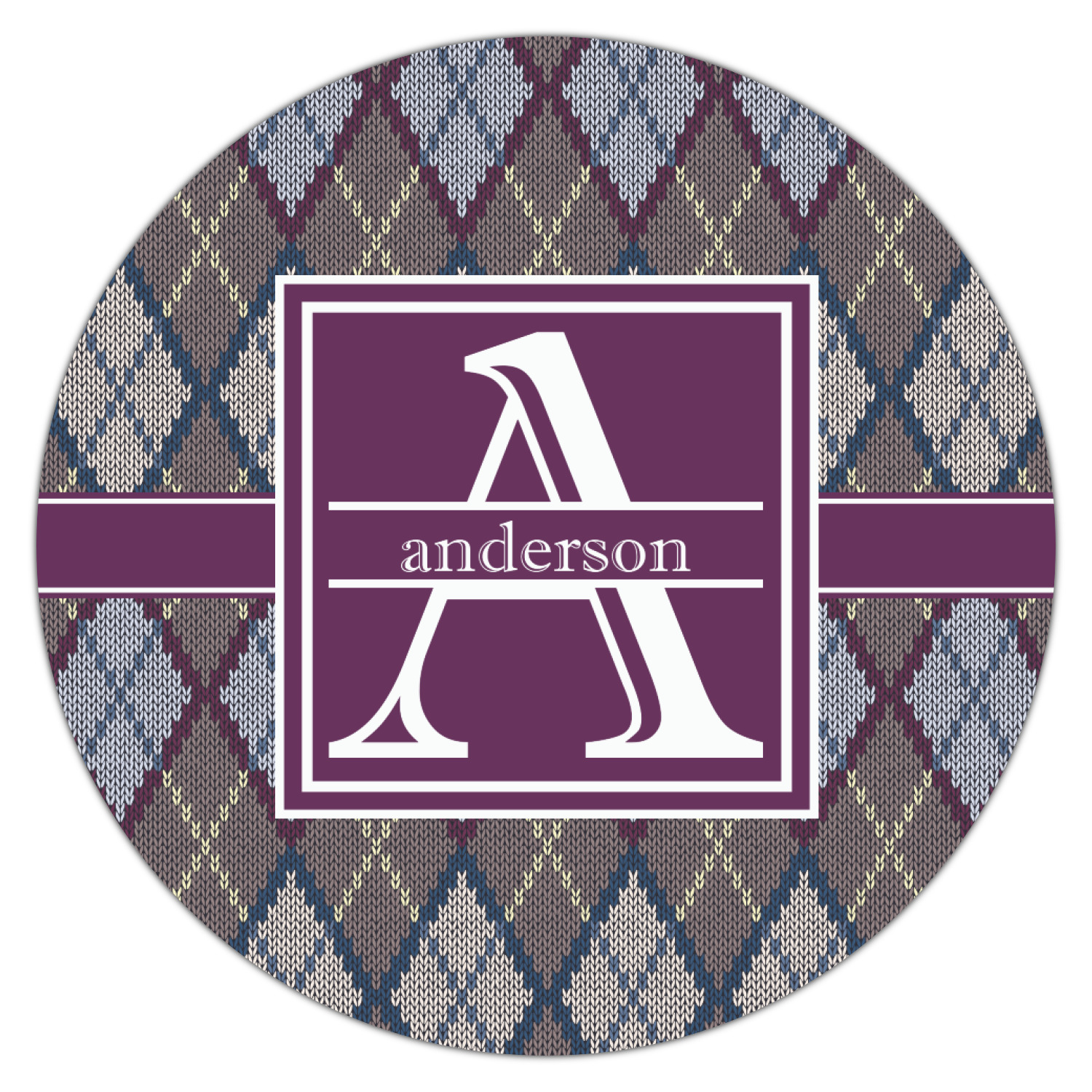 Add a cozy touch of a knit sweater to anything with our Knit Argyle design. The primary color of the design is gray with stitches of dark violet, dark blue, and cream. The design also includes a ribbon and label shown in dark violet.