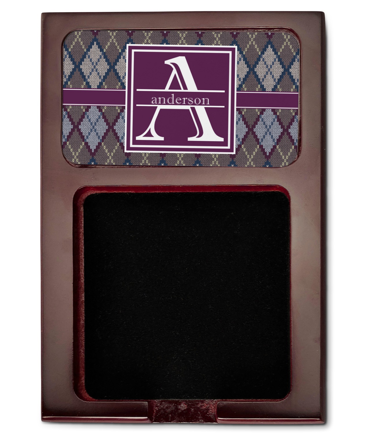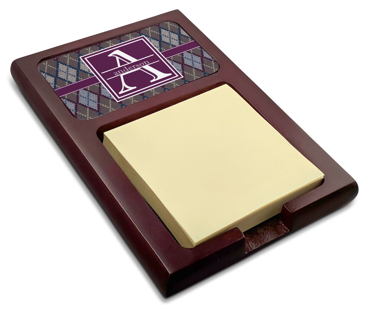 Crafted from a fine mahogany, this post it note holder is in the shade of a dark, cherry color. The dispenser itself is about 4.25 by 6.25 by 0.75 inches. You can place your 3 by 3 inch sticky notes in the indentation below the nameplate. We print your customization onto the nameplate that rests above the velvety indentation.