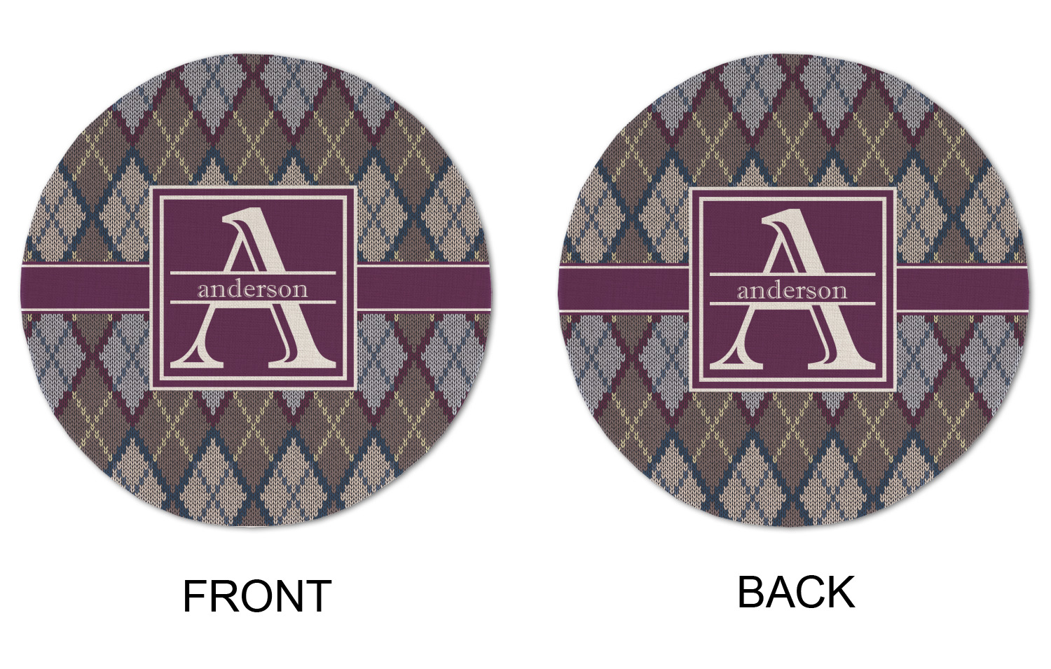 Add a cozy touch of a knit sweater to anything with our Knit Argyle design. The primary color of the design is gray with stitches of dark violet, dark blue, and cream. The design also includes a ribbon and label shown in dark violet.