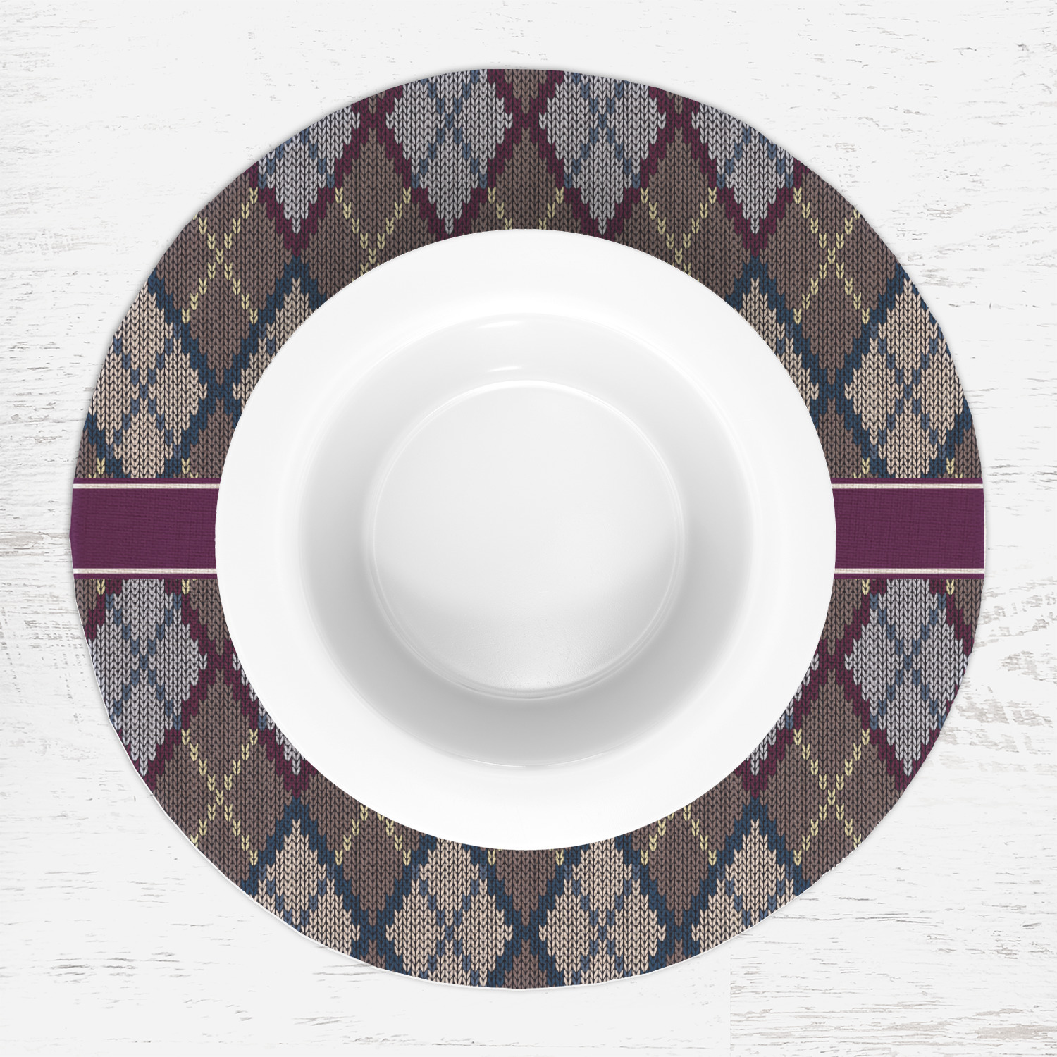 Add a cozy touch of a knit sweater to anything with our Knit Argyle design. The primary color of the design is gray with stitches of dark violet, dark blue, and cream. The design also includes a ribbon and label shown in dark violet.