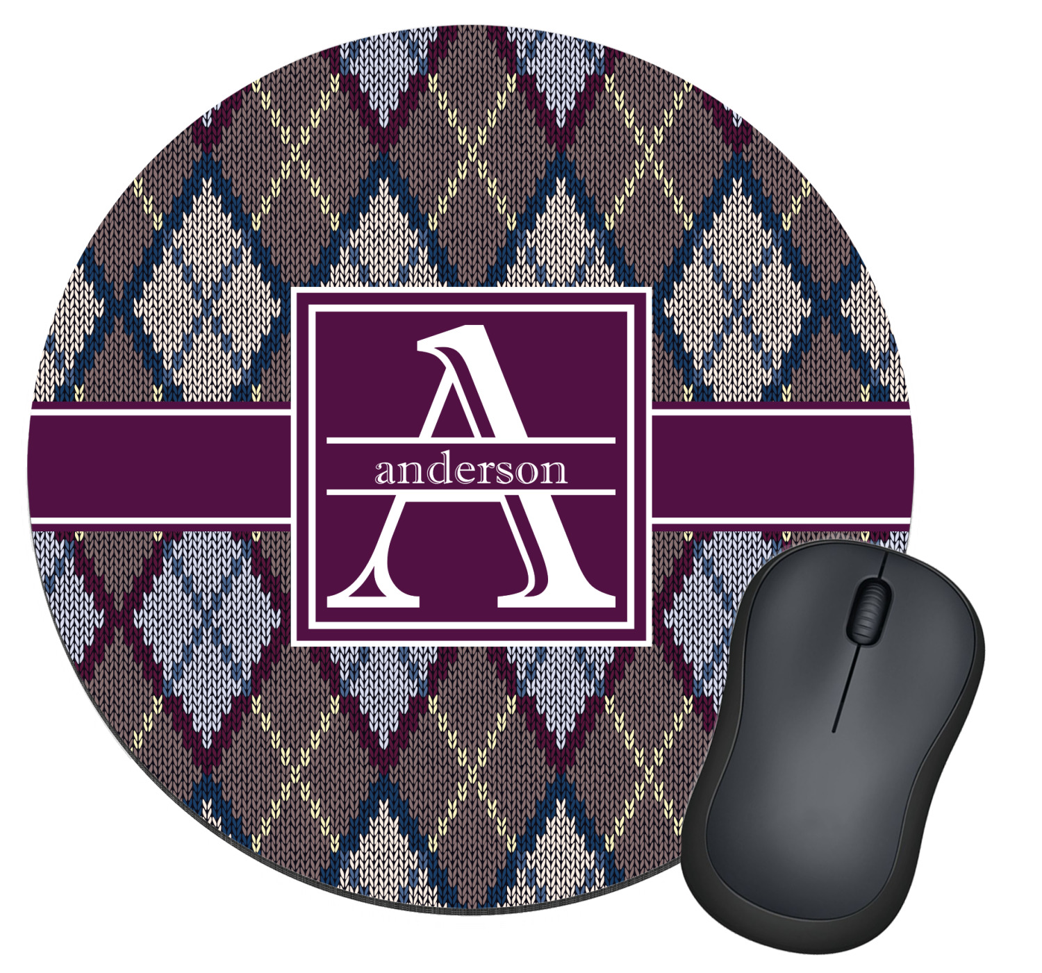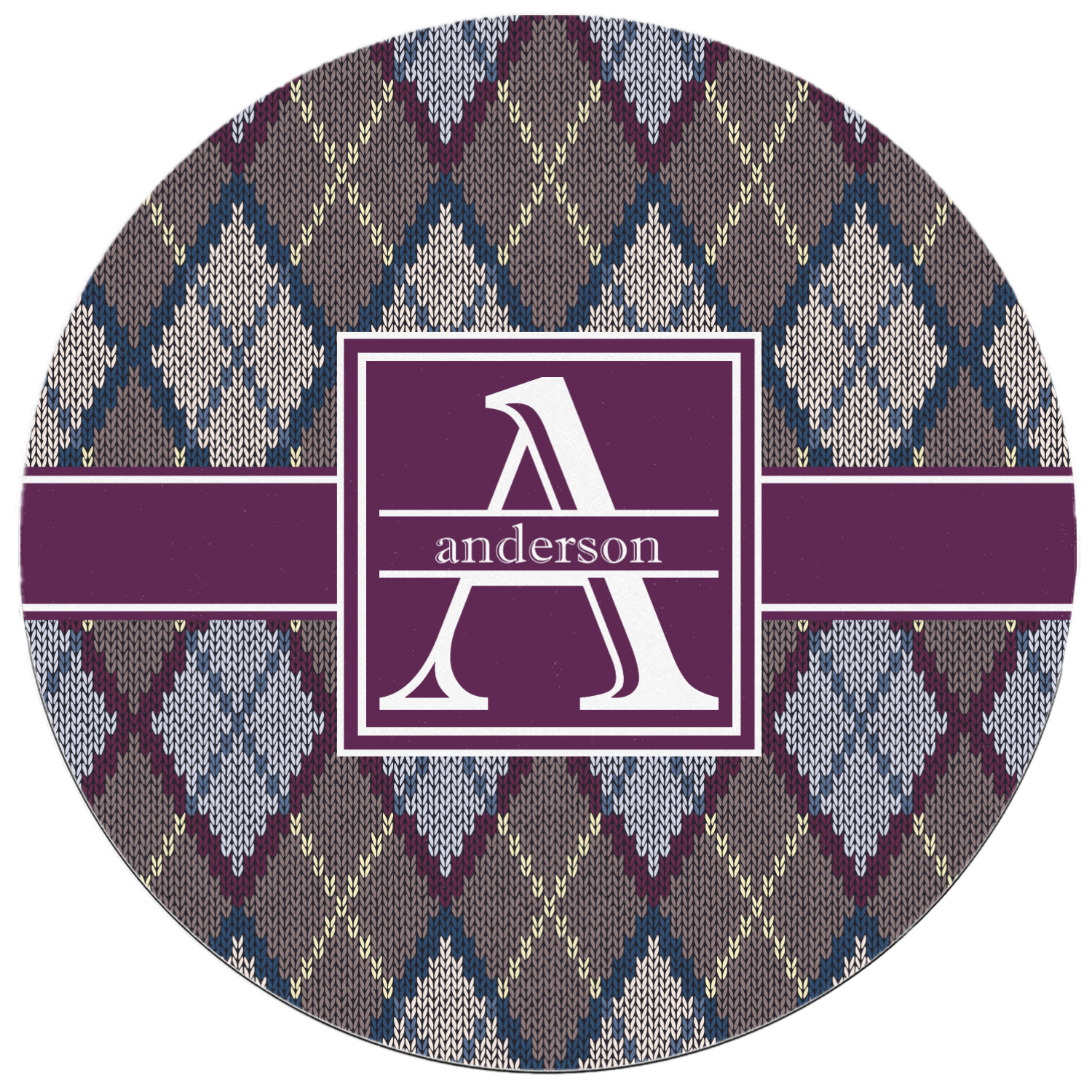 Add a cozy touch of a knit sweater to anything with our Knit Argyle design. The primary color of the design is gray with stitches of dark violet, dark blue, and cream. The design also includes a ribbon and label shown in dark violet.