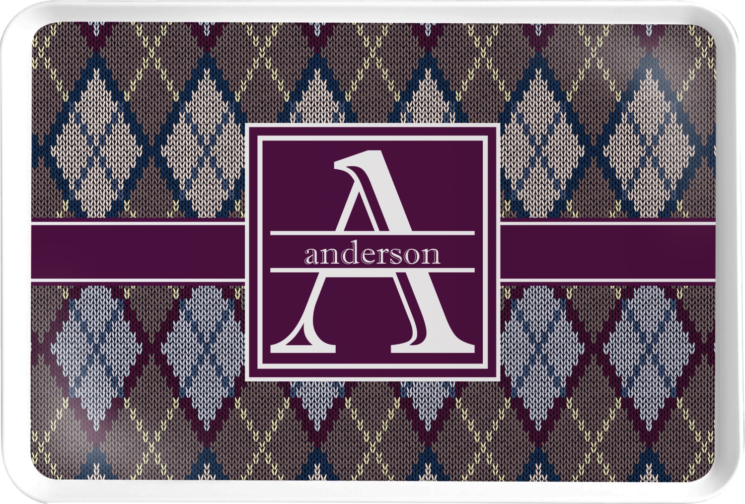 Add a cozy touch of a knit sweater to anything with our Knit Argyle design. The primary color of the design is gray with stitches of dark violet, dark blue, and cream. The design also includes a ribbon and label shown in dark violet.
