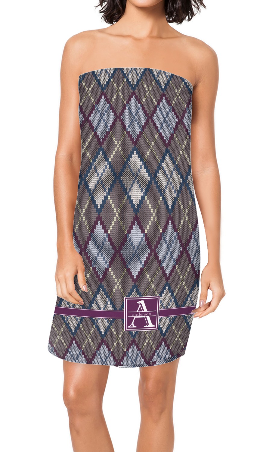 Add a cozy touch of a knit sweater to anything with our Knit Argyle design. The primary color of the design is gray with stitches of dark violet, dark blue, and cream. The design also includes a ribbon and label shown in dark violet.