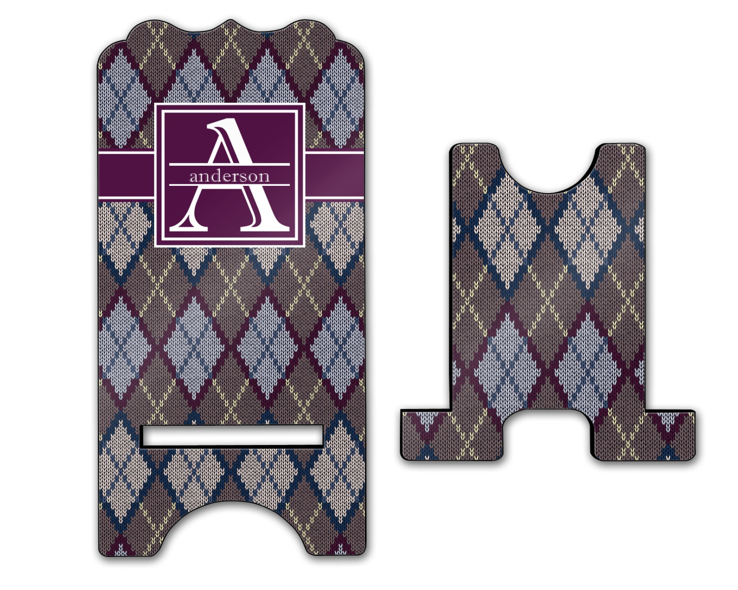 Add a cozy touch of a knit sweater to anything with our Knit Argyle design. The primary color of the design is gray with stitches of dark violet, dark blue, and cream. The design also includes a ribbon and label shown in dark violet.