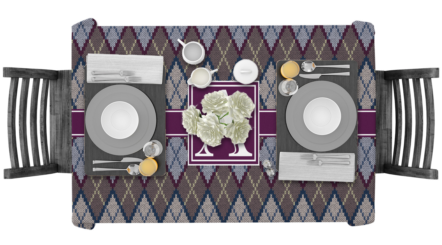 Add a cozy touch of a knit sweater to anything with our Knit Argyle design. The primary color of the design is gray with stitches of dark violet, dark blue, and cream. The design also includes a ribbon and label shown in dark violet.