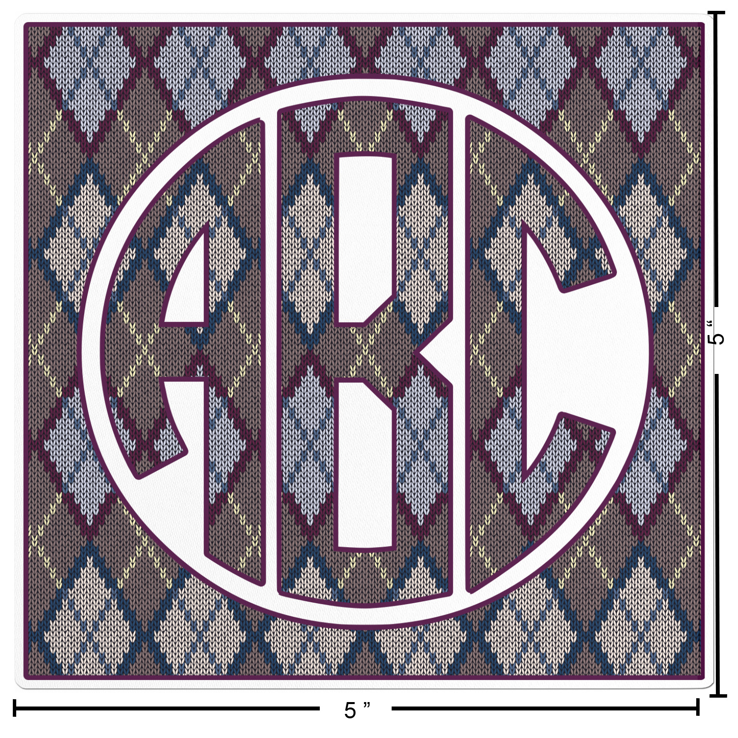 Add a cozy touch of a knit sweater to anything with our Knit Argyle design. The primary color of the design is gray with stitches of dark violet, dark blue, and cream. The design also includes a ribbon and label shown in dark violet.