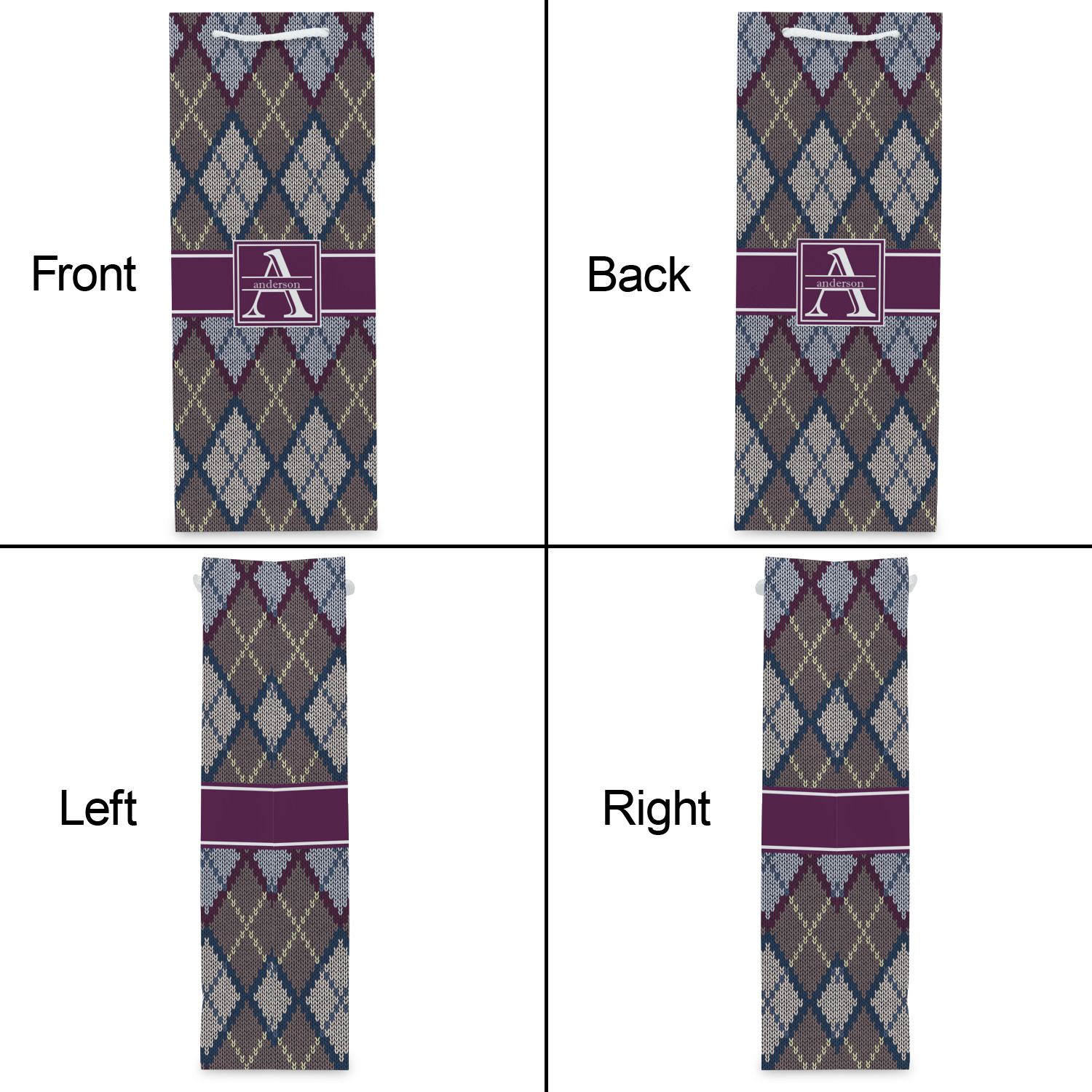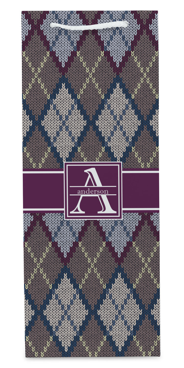Add a cozy touch of a knit sweater to anything with our Knit Argyle design. The primary color of the design is gray with stitches of dark violet, dark blue, and cream. The design also includes a ribbon and label shown in dark violet.