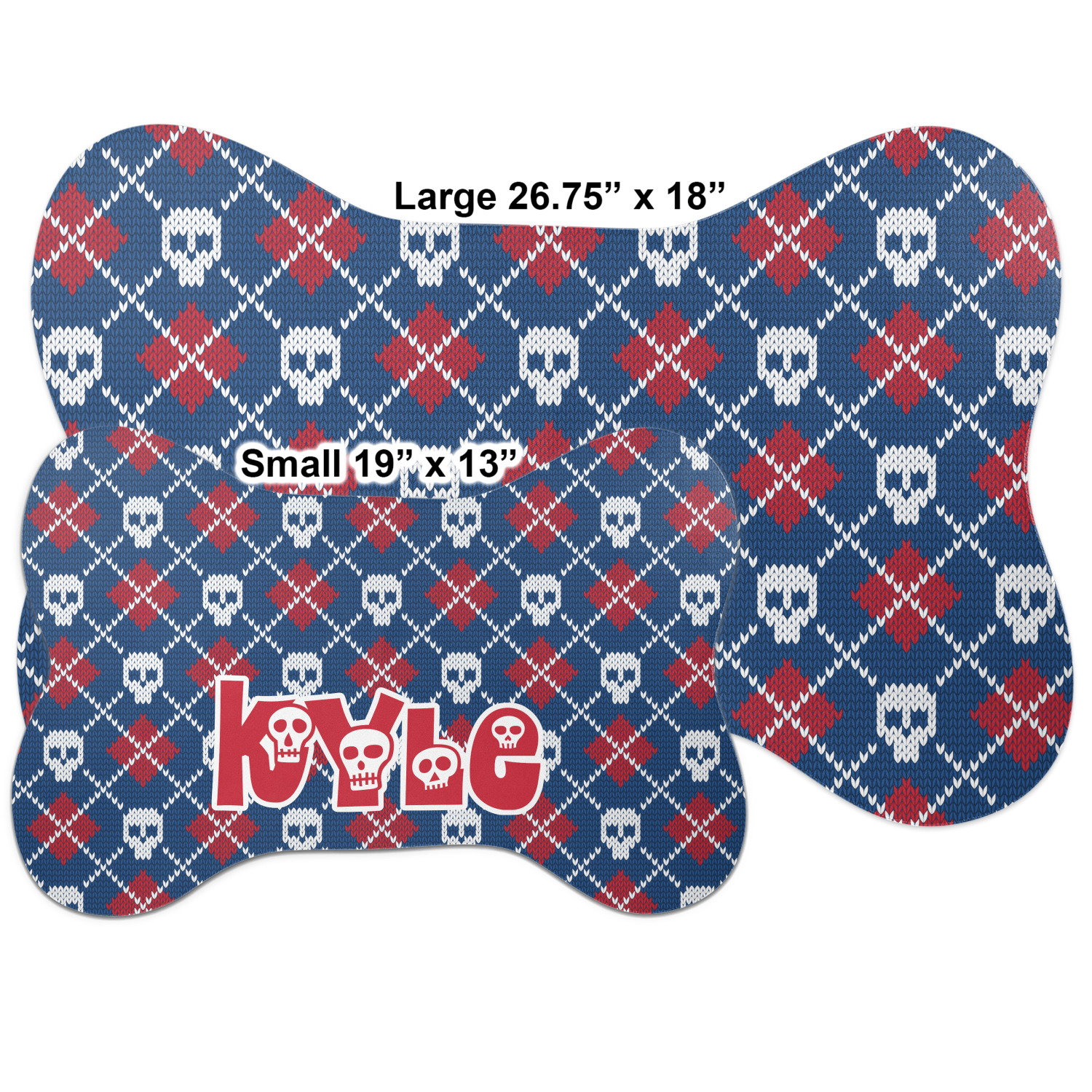 The top of this mat displays your custom design, as it is printed on polyester. To prevent slippage, the underside of the mat is made of rubber. We offer a small dog food mat, suitable for smaller dogs and a large dog food mat for bigger breeds. The small dog food mat is approximately 19 by 13 inches, while the large dog feeding mat measures at approximately 26.75 by 18 inches. Both personalized mats are ideally sized to fit two dog bowls.