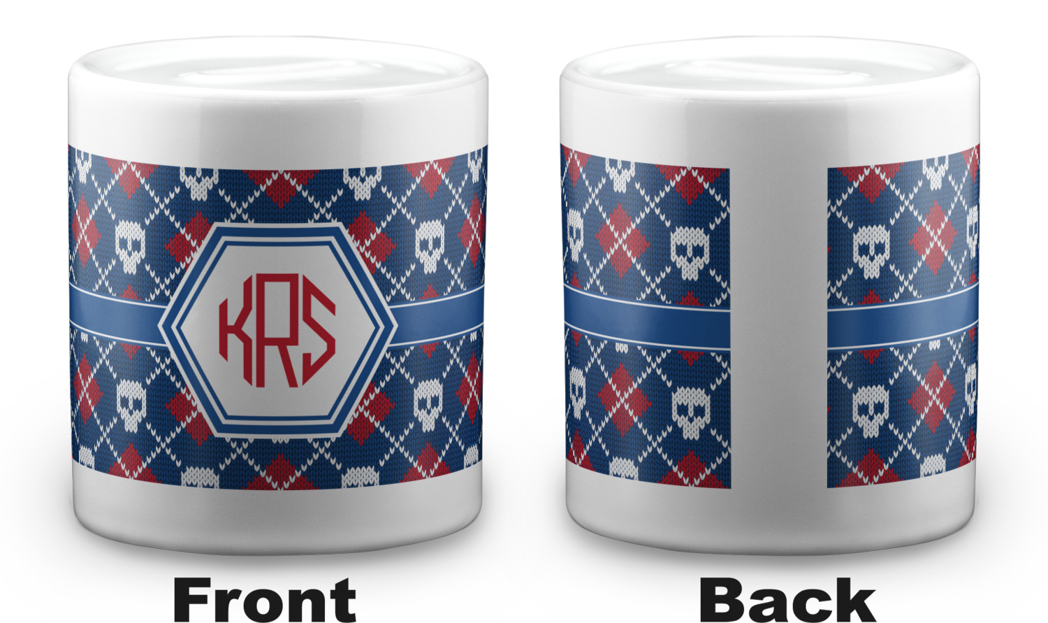 This coin bank is a fun way to decorate a nightstand or a dresser. The bank is a cylindrical shape and is made of ceramic. On the bottom it has a hole big enough for coins to fall out of easily with a rubber plug to stop them from falling when on display. On the top of the bank there is a large slit big enough to slide your coins through with ease. The coin bank measures at approximately 3.75" x 3.25".