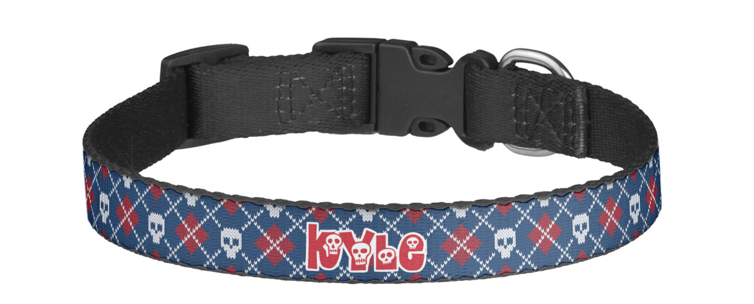 This sturdy collar, made from a durable nylon weave, will outlive your dog's episodes of excited tugging and pulling. Courtesy of its thick plastic buckle and adjuster, this collar is adjustable and accommodating of any dog. Structurally, the collar is a single piece of nylon weave that is sewn together, and features a solid metal loop where you can attach a leash or dog tag. We print and display your dog's name and pattern across the middle of the personalized dog collar.