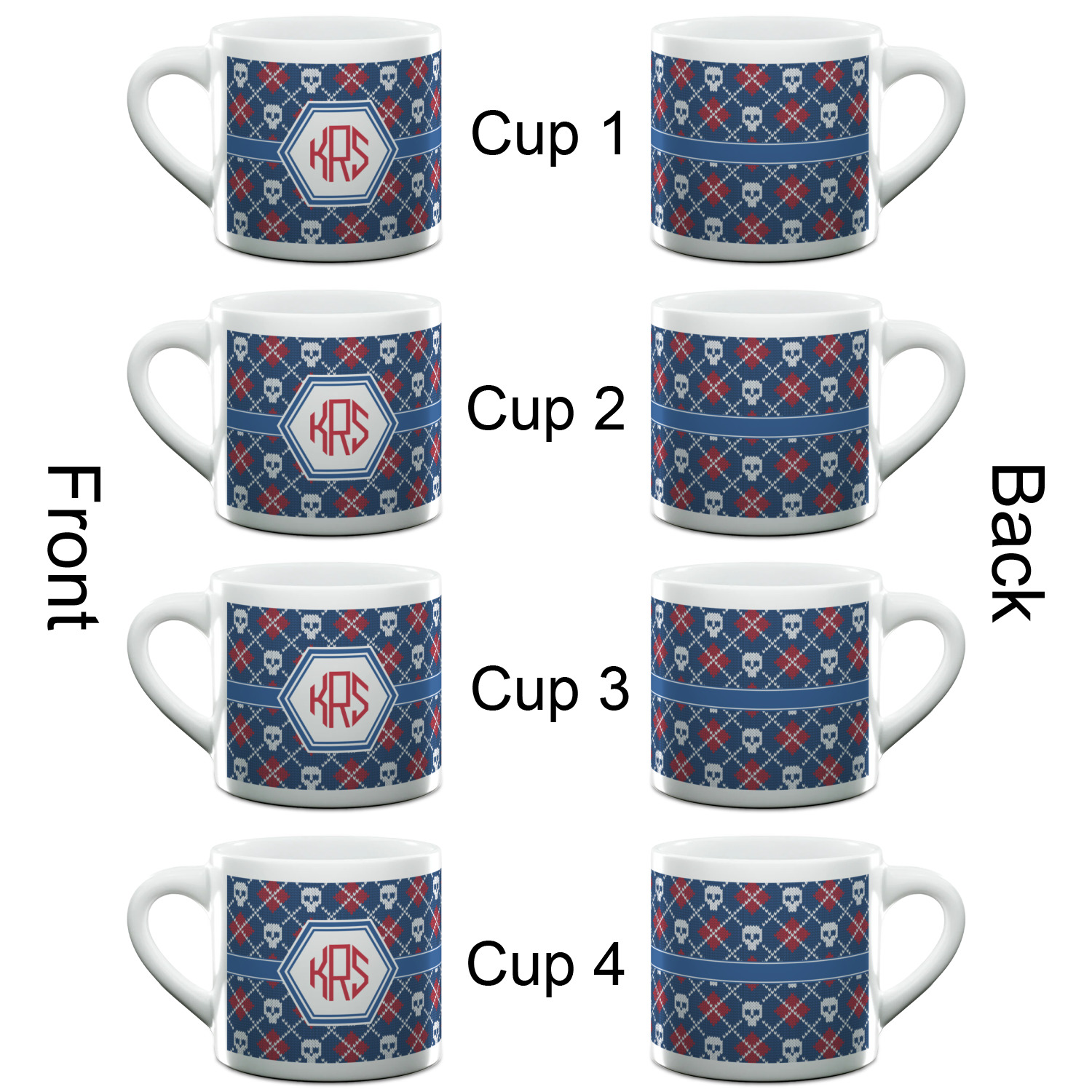 Each of our espresso mugs is a ceramic material sure to keep your drink warm. Personalize one cup for yourself, or order a set of 4! Its the perfect little gift for any coffee lover! We carry two sizes for you to personalize - 3 oz. (approx. 3.25" x 2.325" x 2.625") or 6 oz. (approx. 4" x 2.9" x 2.9"). Our 3 oz. mug is perfect for that single shot espresso while our 6 oz. mug can be your next favorite cappuccino cup holding two shots of espresso!