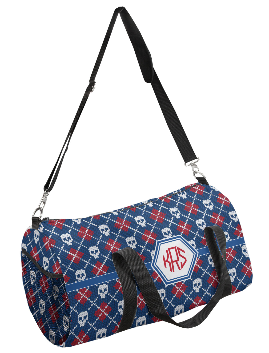 This duffle is a sturdy bag made of a canvas material. It comes in two sizes: Small (19"W x 9.5"H x 9.5"D) and Large (23"W x 12"H x 12"D). The bag is a cylindrical shape with a black adjustable strap and two handles. On one side is an elastic pouch to put a waterbottle or other small item. Your product will be sublimated with your design and is able to be designed on the front, back, and sides. Be sure to remember that the straps may cut into parts of your design if you upload your own artwork.