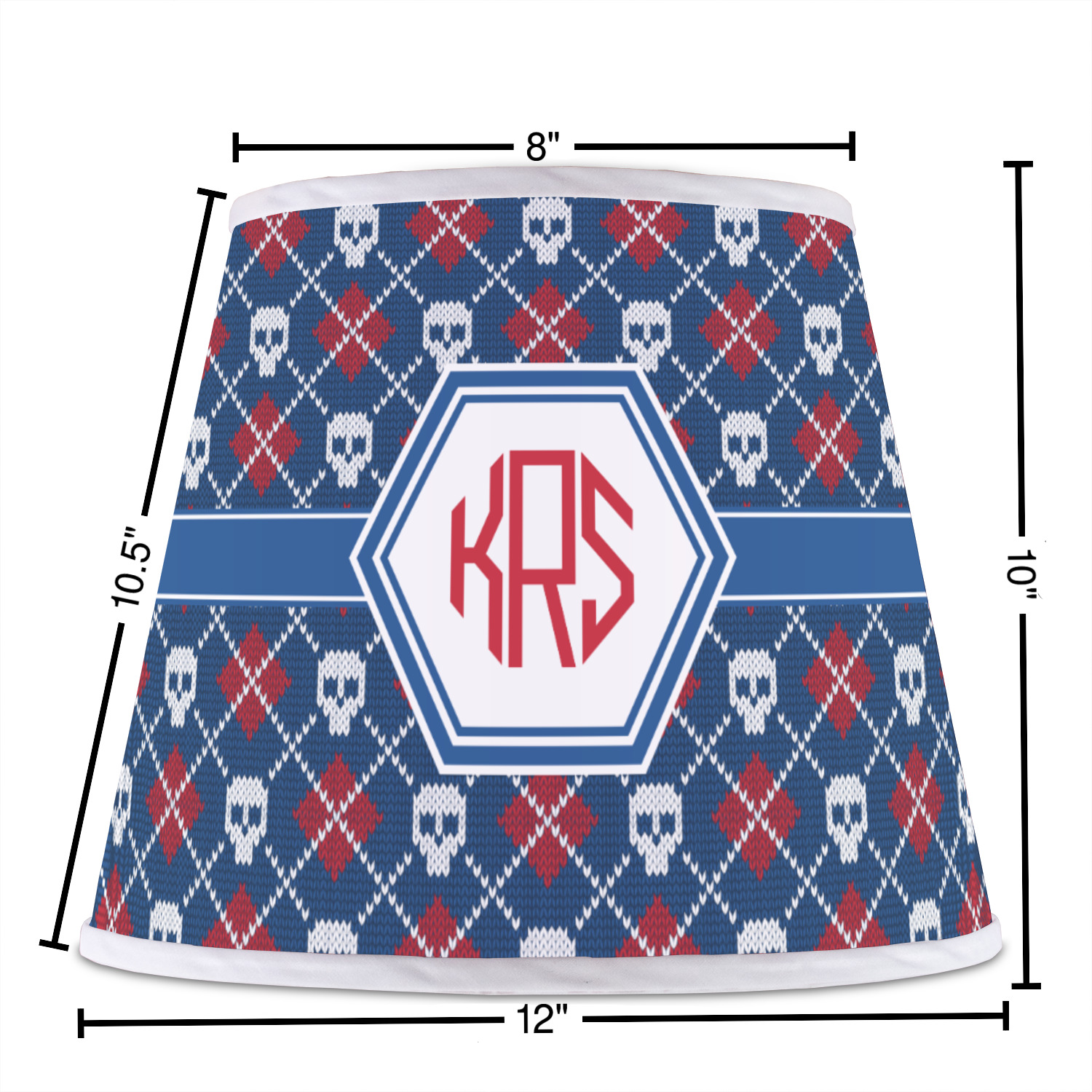 The base of this lampshade is 12 inches in diameter, and the top spans 8 inches in diameter. The total height of the lampshade is 10 inches. The angled nature of this custom lampshade concentrates the light, making it ideal for smaller spaces. This lampshade is made of matte, polyfilm, and displays your customization in its middle. The top and bottom of this colorful lamp shade are lined with a white fabric ribbon (which can be replaced with black inside the design studio) which frames your design and creates a sophisticated finish. As an UNO fitter lampshade, this unique lamp shade will fit a variety of bases.