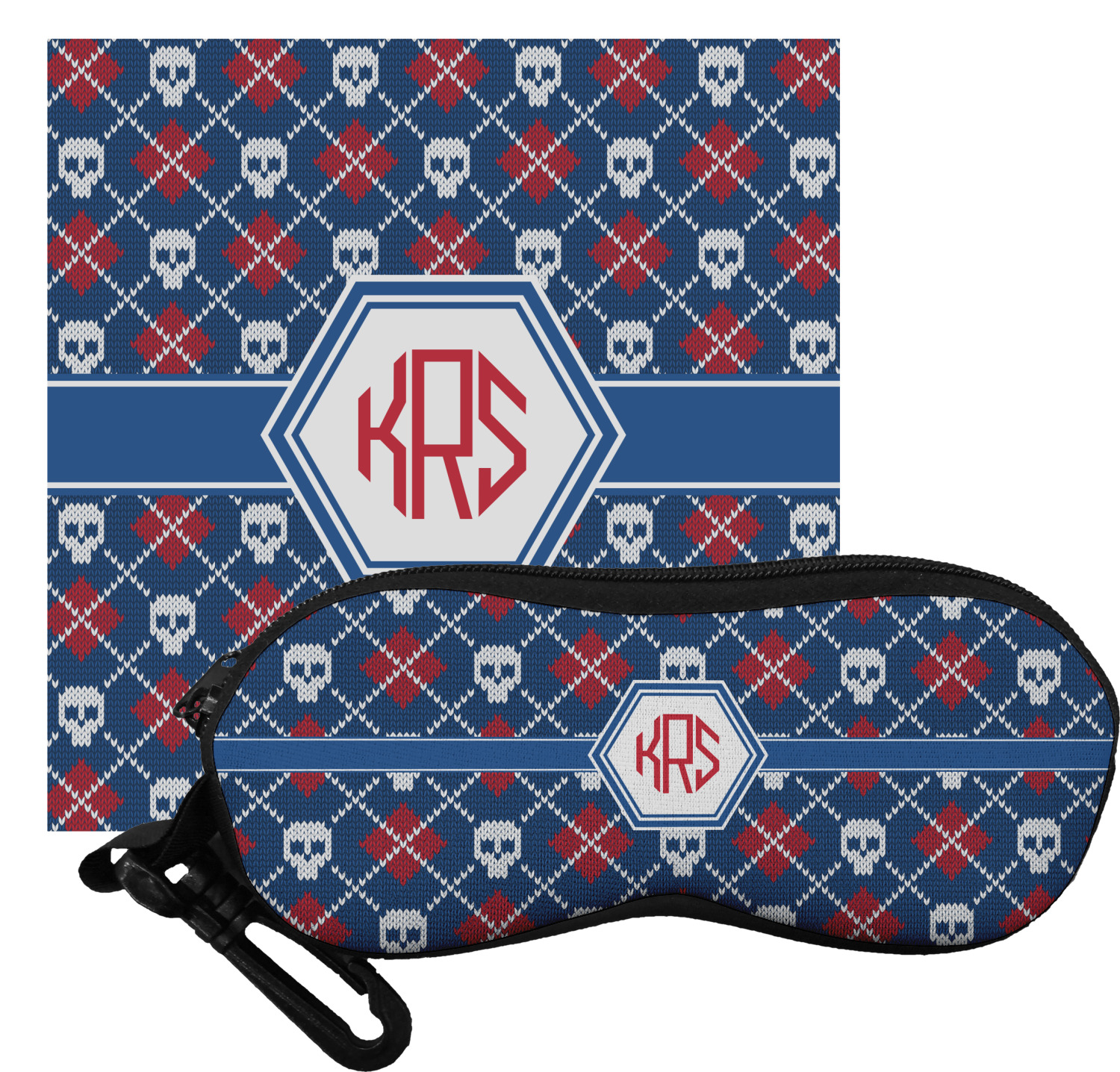 The cases have the design on both sides, a black zipper, and clips for hanging on a belt buckle or purse strap and also include matching lens cloths.