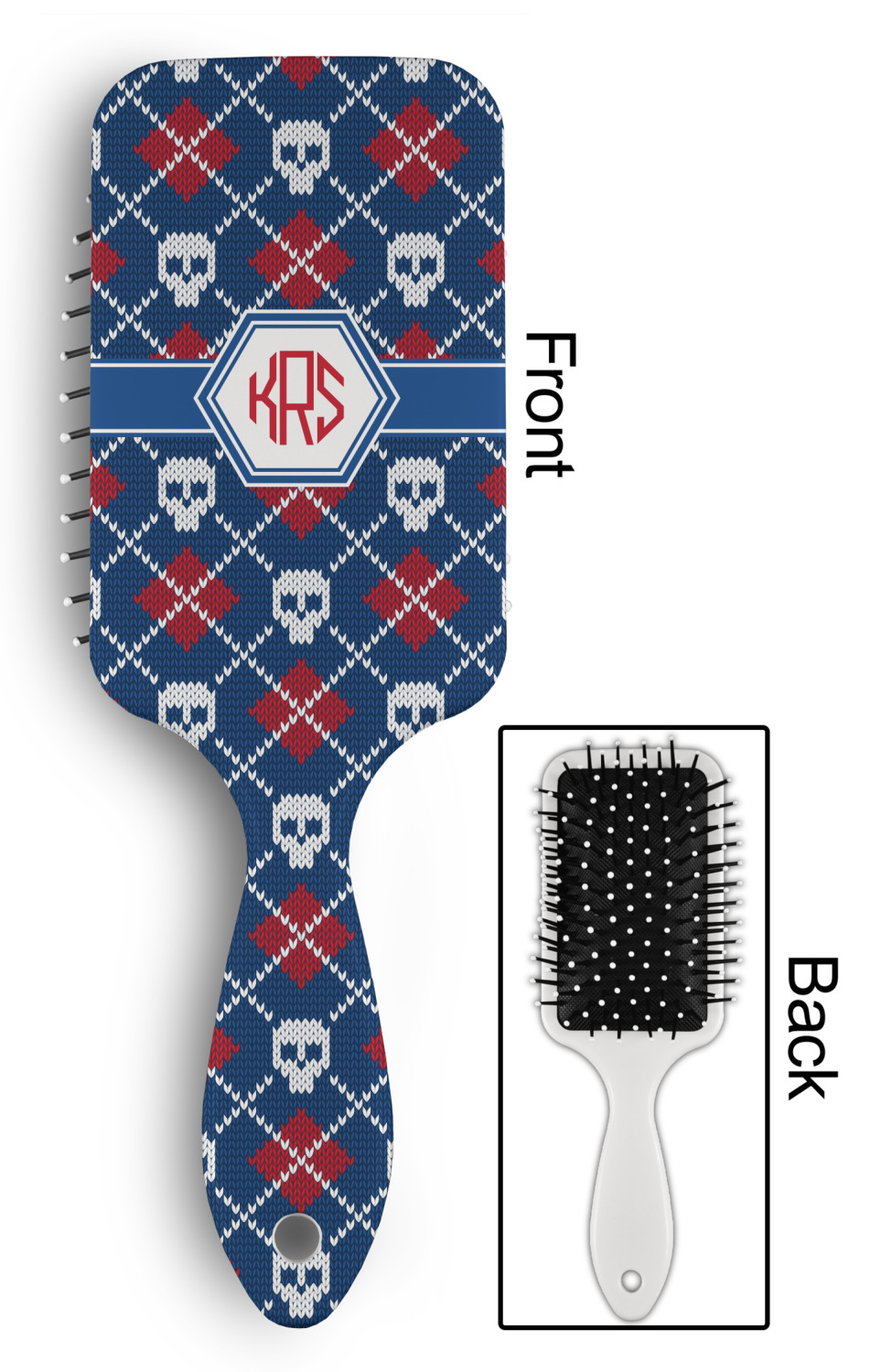 Your designed is printed on the front of the brush.; The back handle and sides are white.