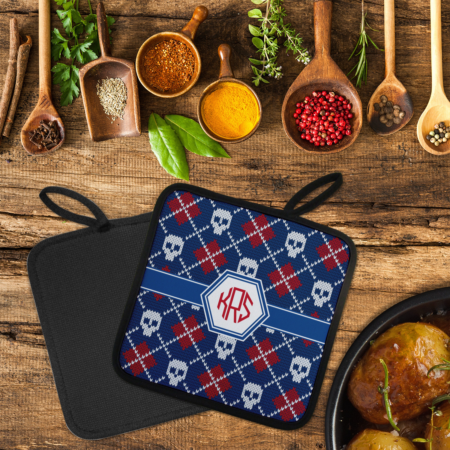 Our personalized pot holders feature a neoprene front that displays your personalization in vibrant colors. The backing of the hot pot holder is rubberized; the textured backing allows you to have a great grip when using this custom pot holder. The two materials are joined with a sleek, black trim, and the holder also includes an attached loop for hanging and storage. The pot holder is approximately 8.75 inches by 8.75 inches and 0.25 inches tall, while the fabric loop is 2.5 inches long. You can purchase a kitchen pot holder by itself or as a set of 2. We also offer a set including one pot holder and one oven mitt.