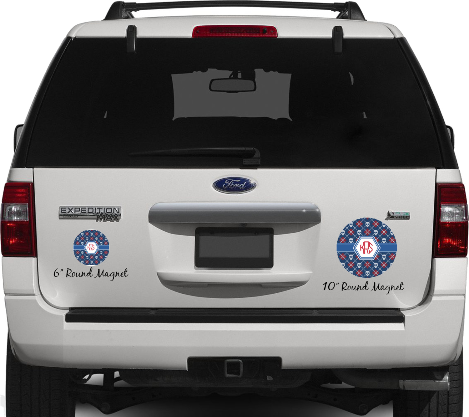 Your personalized car magnets are available for purchase in two shapes and two sizes. We carry round and square editions; each shape can either be 6 by 6 inches, or 10 by 10 inches, depending on your needs. Both versions are 1 millimeter thick, which is considered, within the industry, as the ideal thickness for automobile magnets. The magnetic car decals will adhere to any smooth, metal surface of your cars body, such as the trunk door or a side panel. However, please note that some vehicles are constructed from fiberglass bodies, which prevents the adhesion of anything magnetic. We advise that you test your vehicle before purchasing these magnets.