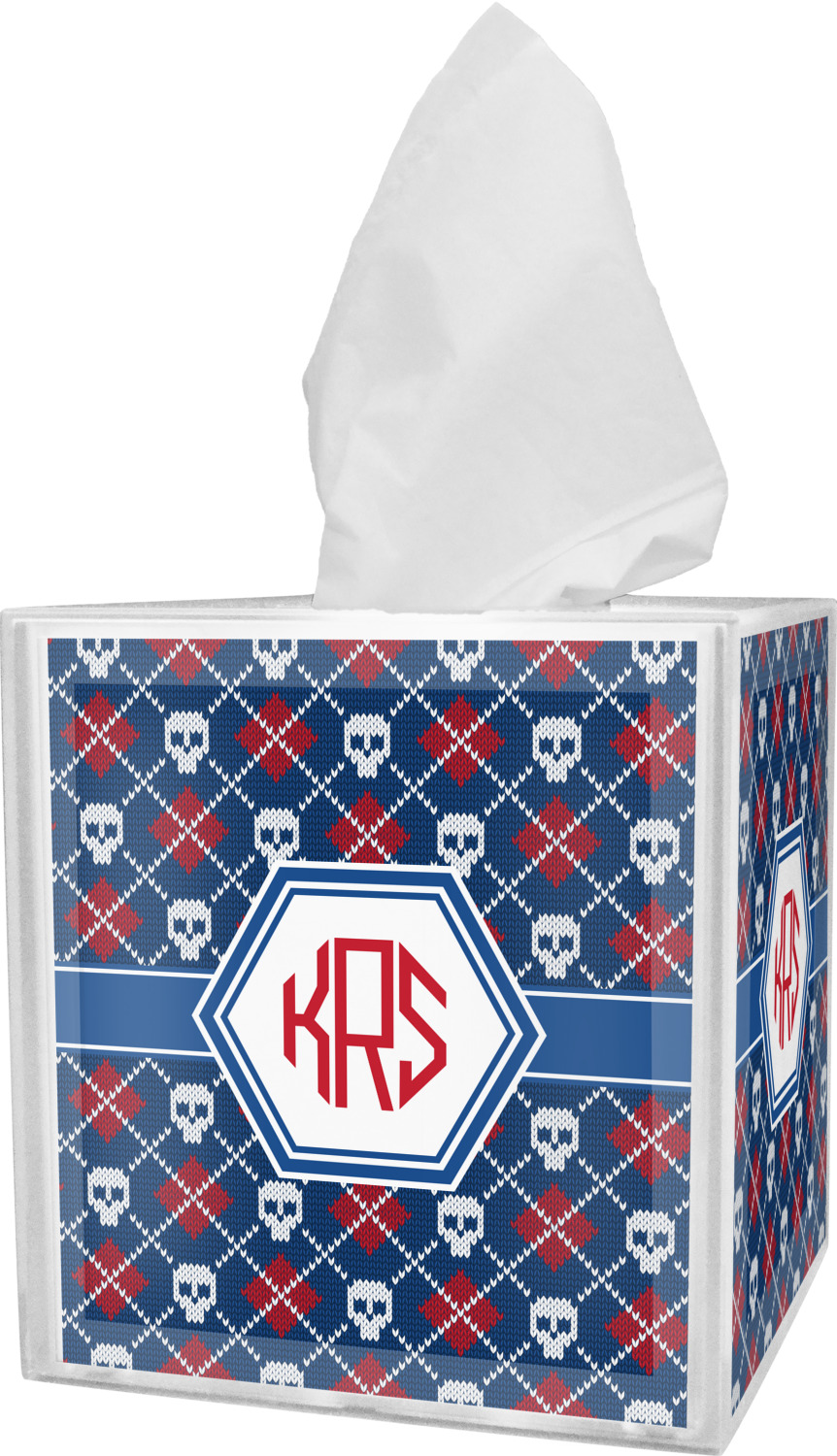 These tissue holders are built from durable acrylic and display your unique personalization on fine-quality vinyl inserts placed within the four sides and top. The box features two pieces, allowing you to easily switch out tissue boxes. On the sides, youll find ridges that ensure the top and base fit securely in place. The bottom of these tissue box holders has four, rubber, non-slip pads to prevent the box from scuffing any surface you decide to display it on. Each box can fit a standard 5 by 5-inch box of tissues.
